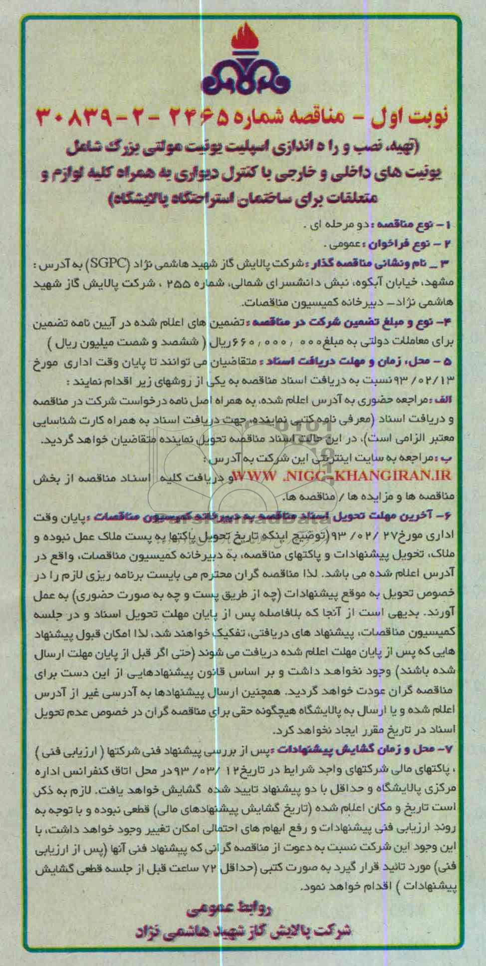 نام و نشانی مناقصه گزار: شرکت پالایش گاز شهید هاشمی نژاد (PGPC) به آدرس: مشهد، خیابان آبکوه، نبش دانشسرای شمالی شماره 255، شرکت پالایش گاز شهید هاشمی نژاد- دبیرخانه کمیسیون مناقصات