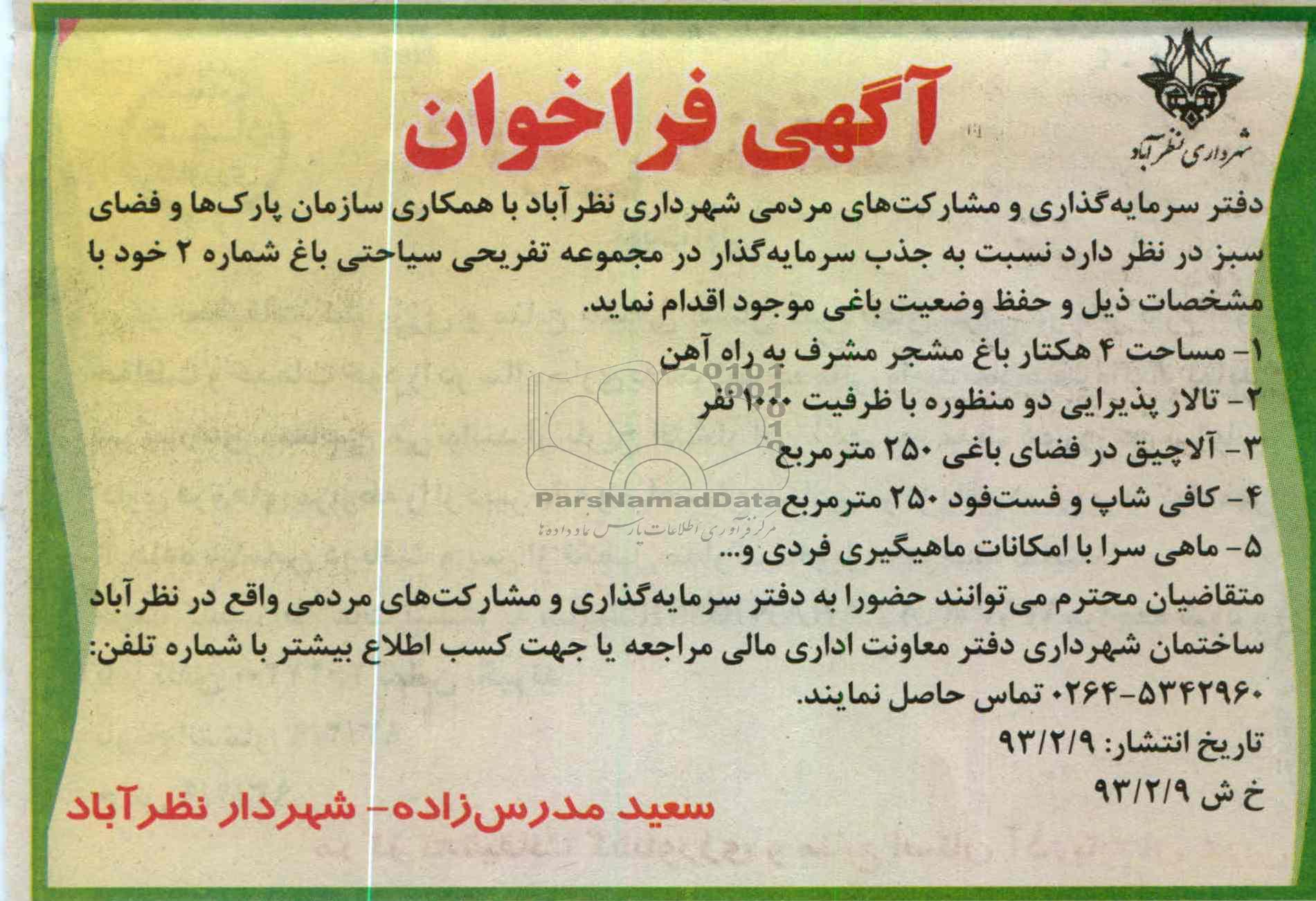 دفتر سرمایه گذاری و مشارکت های مردمی شهرداری نظرآباد با همکاری سازمان پارک ها و فضای سبز در نظر دارد نسبت به جذب سرمایه گذار در مجموعه تفریحی سیاحتی باغ شماره 2 خود با مشخصات ذیل و حفظ وضعیت باغی موجود اقدام نماید.