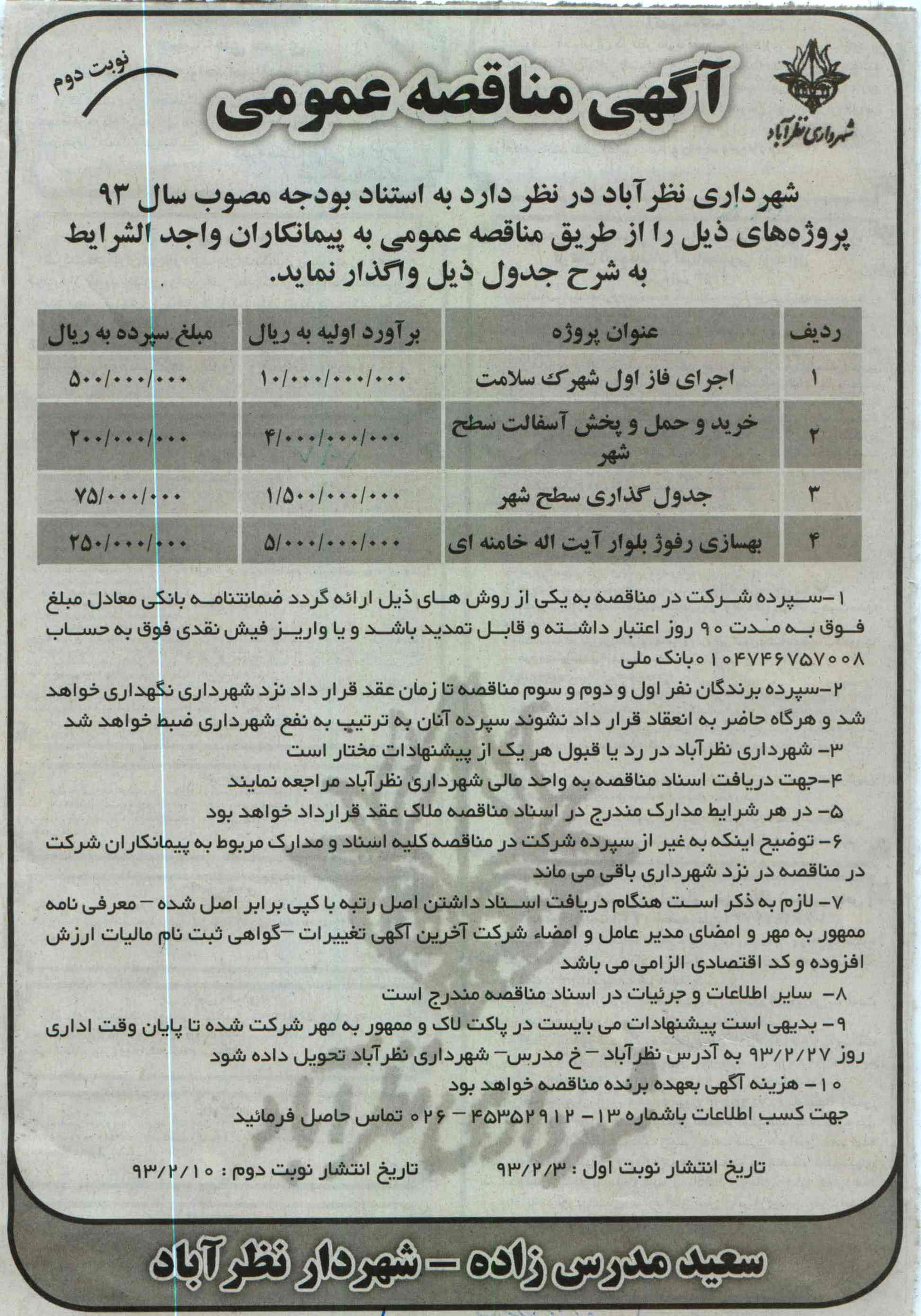 بدیهی است پیشنهادات می بایست در پاکت لاک و ممهور به مهر شرکت شده تا پایان وقت اداری روز 93.2.27 به آدرس نظرآباد خیابان مدرس شهرداری نظرآباد تحویل داده شود