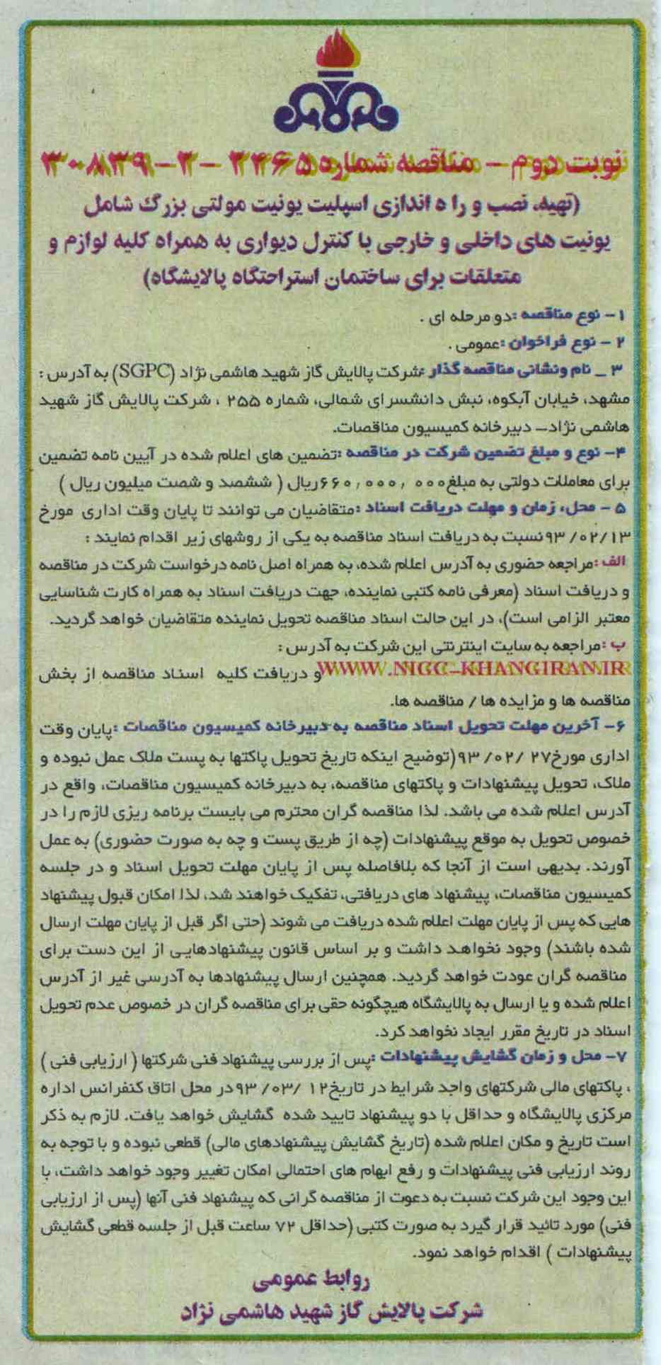 نام و نشانی مناقصه گزار: شرکت پالایش گاز شهید هاشمی نژاد (PGPC) به آدرس: مشهد، خیابان آبکوه، نبش دانشسرای شمالی شماره 255، شرکت پالایش گاز شهید هاشمی نژاد- دبیرخانه کمیسیون مناقصات