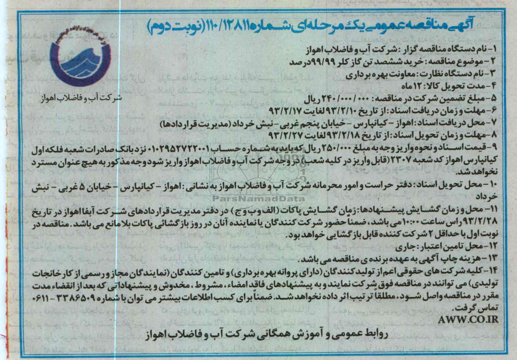 2- موضوع مناقصه: خرید ششصد تن گاز کلر 99/99 درصد