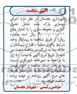 شهرداری بجستان در نظر دارد اجرای بهسازی پارک ملت شامل جدول گذاری و محوطه سازی را با اعتبار 3.000.000.000 ریال- سه میلیارد ریال را از طریق مناقصه به پیمانکار واجدشرایط واگذار نماید، لذا از پیمانکاران علاقه مند به شرکت در مناقصه دعوت می شود از تاریخ درج آگهی به مدت 10 روز با مراجعه به دبیرخانه شهرداری نسبت به دریافت اسناد مناقصه و اعلام قیمت پیشنهادی اقدام نمایند در ضمن هزینه های درج آگهی روزنامه بر عهده برنده مناقصه خواهد بود.
