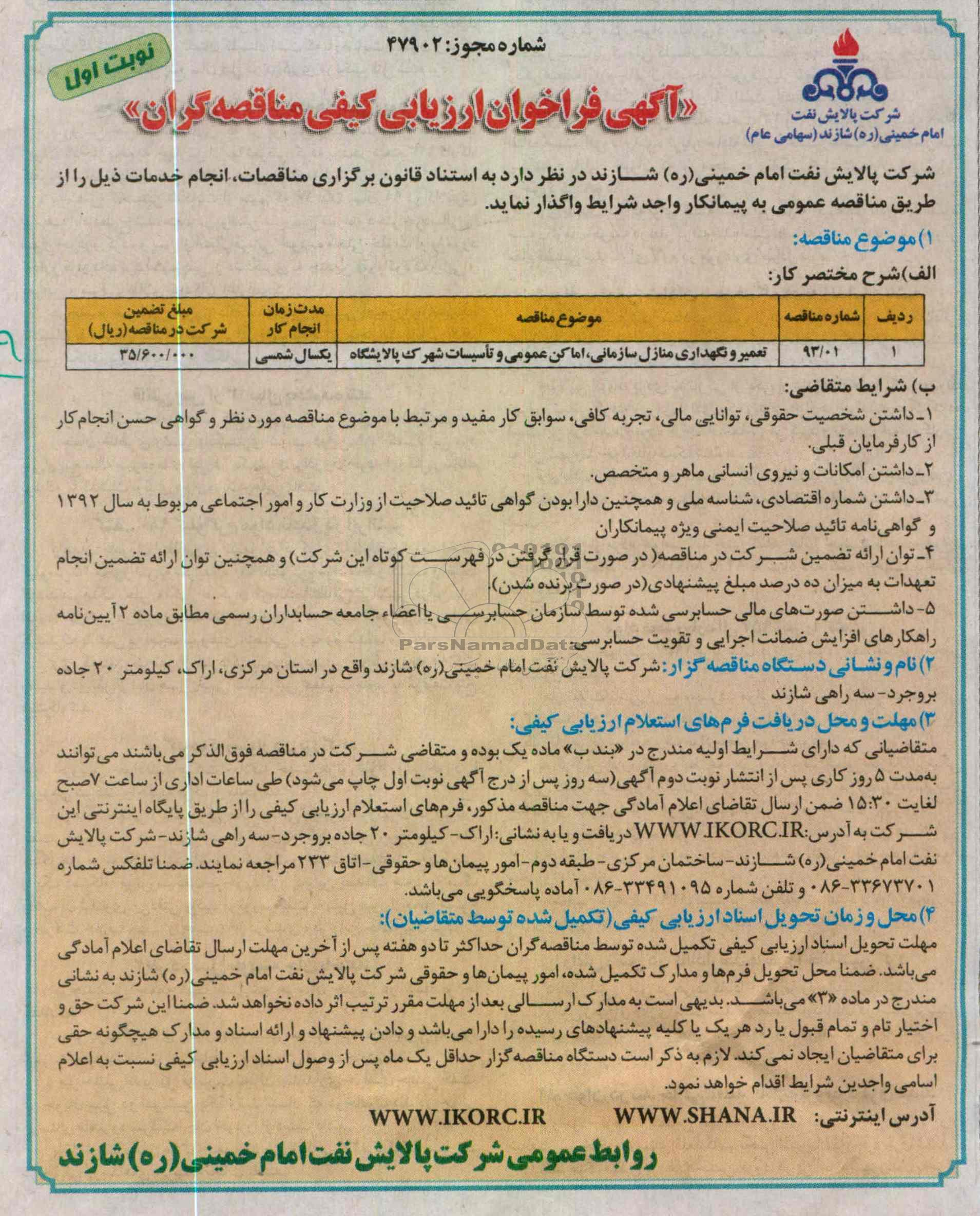 | 1/93 | تعمیر و نگهداری منازل سازمانی , اماکن عمومی و تاسیسات شهرک پالایشگاه | یک سال شمسی |