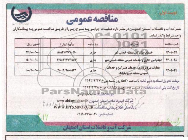 | 93-1-38 | انجام امور اداری و خدمات عمومی منطقه خمینی شهر | جاری | 3.503.772.504 | 150.000.000 |