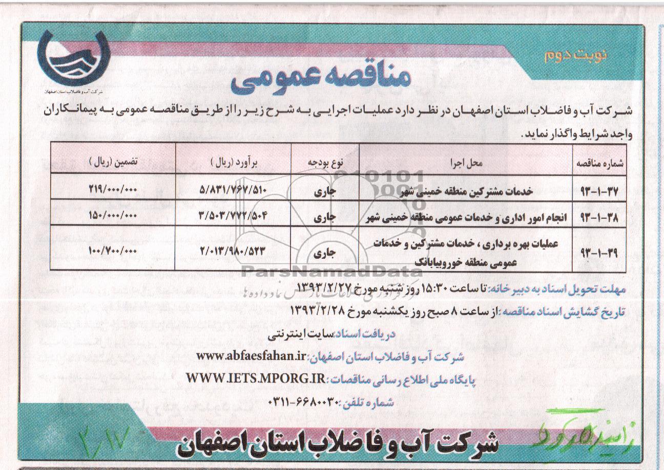 | 93-1-38 | انجام امور اداری و خدمات عمومی منطقه خمینی شهر | جاری | 3.503.772.504 | 150.000.000 |