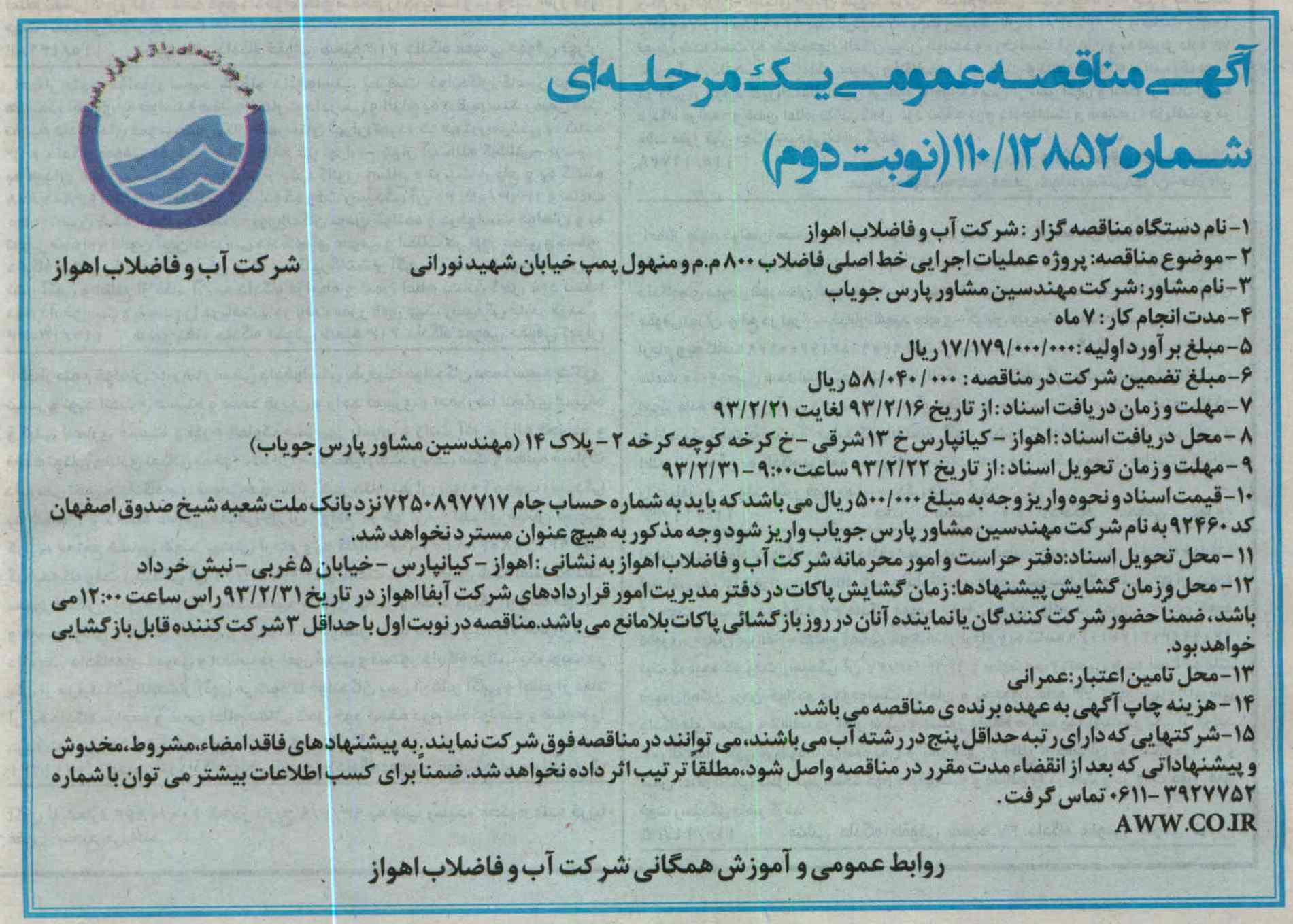 12- محل و زمان گشایش پیشنهادها: زمان گشایش پاکات در دفتر مدیریت امور قراردادهای شرکت آبفا اهواز در تاریخ 93.2.31 راس ساعت 12 می باشد، ضمنا حضور شرکت کنندگان یا نماینده آنان در روز بازگشایی پاکات بلامانع می باشد. مناقصه در نوبت اول با حداقل 3 شرکت کننده قابل بازگشایی خواهد بود.