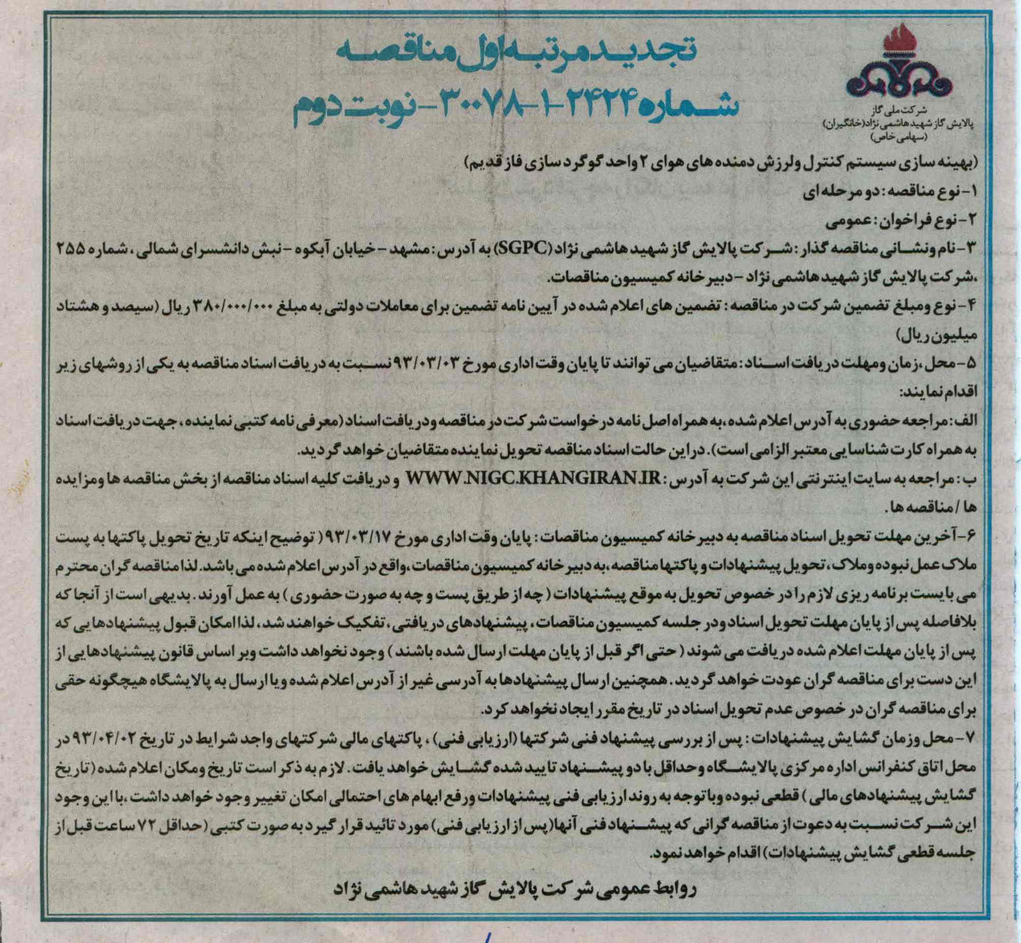 نام و نشانی مناقصه گذار: شرکت پالایش گاز شهید هاشمی نژاد SGPC به آدرس مشهد خیابان آبکوه نبش دانشسرای شمالی شماره 255 شرکت پالایش گاز شهید هاشمی نژاد دبیرخانه کمیسیون مناقصات