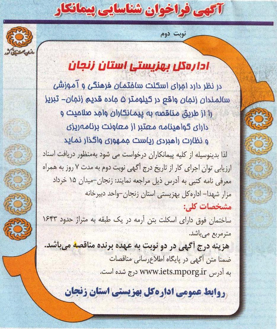 لذا بدینوسیله از کلیه پیمانکاران درخواست می شود به منظور دریافت اسناد ارزبابی توان اجرای کار از تاریخ درج آگهی نوبت دوم به مدت 7 روز به همراه معرفی نامه کتبی یه آدرس ذیل مراجعه نمایند: زنجان - میدان 15 خرداد مزار شهدا - اداره کل بهزیستی استان زنجان - واحد دبیرخانه