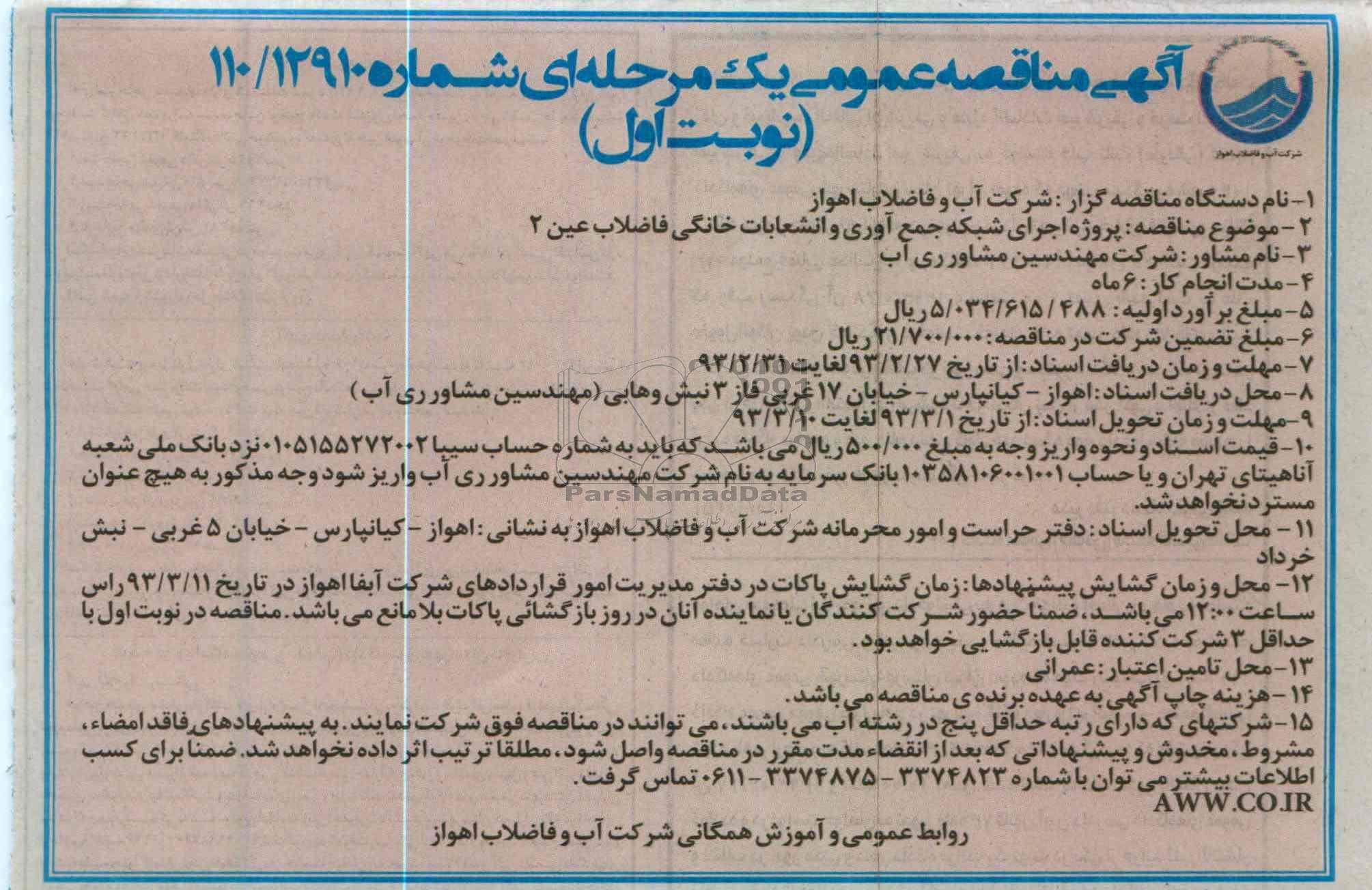 آگهی مناقصه عمومی یک مرحله ای, پروژه اجرای شبکه جمع آوری و انشعاب خانگی فاضلاب
