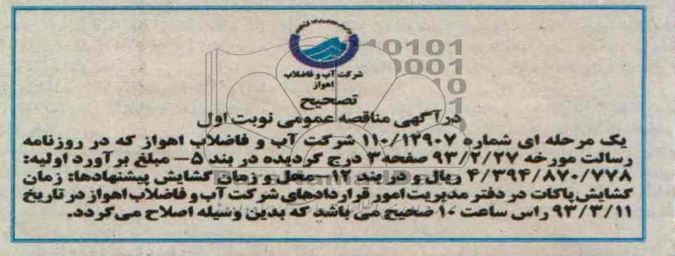 یک مرحله ای شماره 12907/110 شرکت آب و فاضلاب اهواز که در روزنامه رسالت مورخه 93.2.27 صفحه 3 درج گردیده در بند 5- مبلغ برآورد اولیه 4.394.870.778 ریال و در بند 12 محل و زمان گشایش پیشنهادها زمان گشایش پاکات در دفتر مدیریت امور قراردادهای شرکت آب و فاضلاب اهواز در تاریخ 93.3.11 راس ساعت ده صبح صحیح می باشد که بدین وسیله اصلاح میگردد
