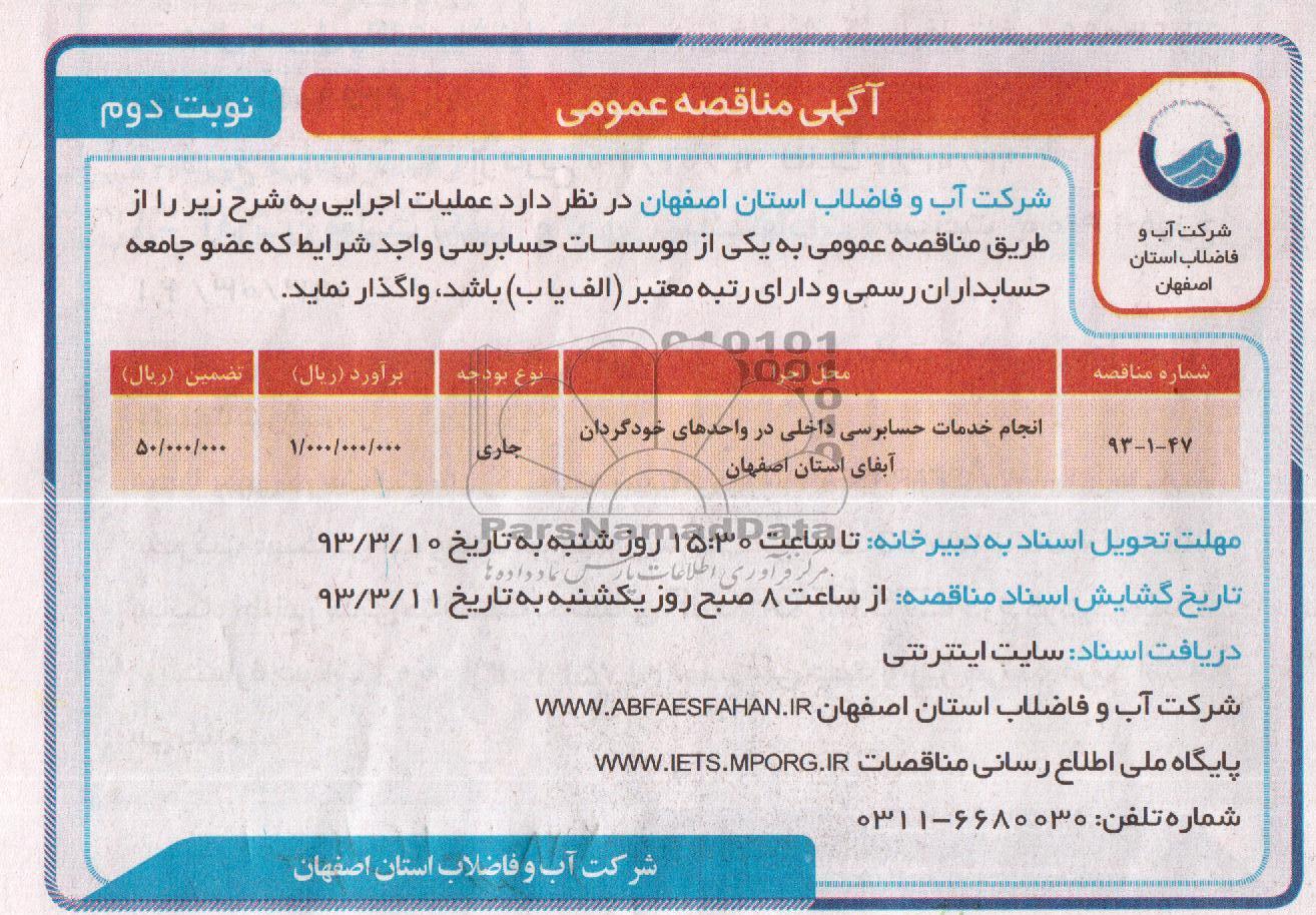 | 93-1-47 | انجام خدمات حسابرسی داخلی در واحدهای خودگردان آبفای استان اصفهان | جاری | 1.000.000.000 | 50.000.000 |