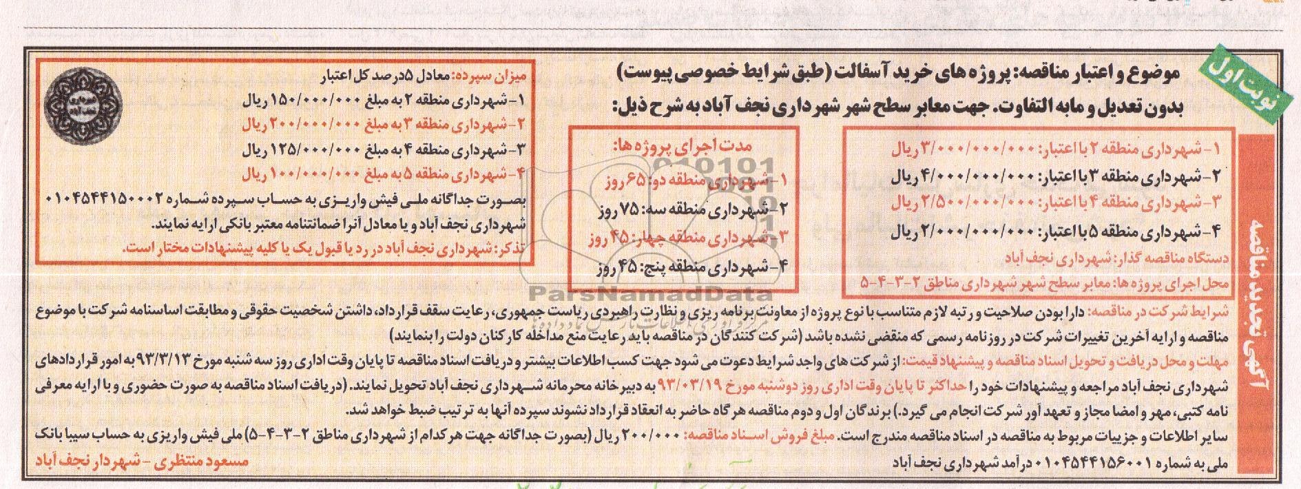موضوع و اعتبار مناقصه: پروژه های خرید آسفالت (طبق شرایط خصوصی پیوست) بدون تعدیل و مابه التفاوت، جهت معابر سطح شهر شهرداری نجف آباد به شرح ذیل:
