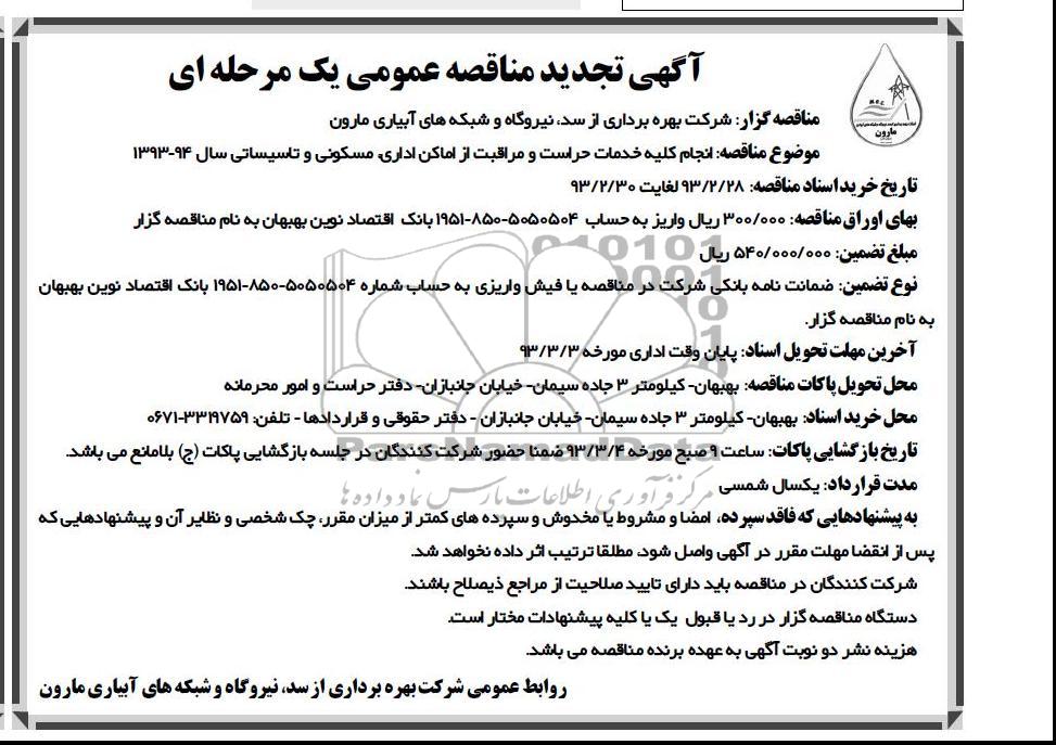 موضوع مناقصه: انجام کلیه خدمات حراست و مراقبت از اماکن اداری, مسکونی و تاسیساتی 94-93