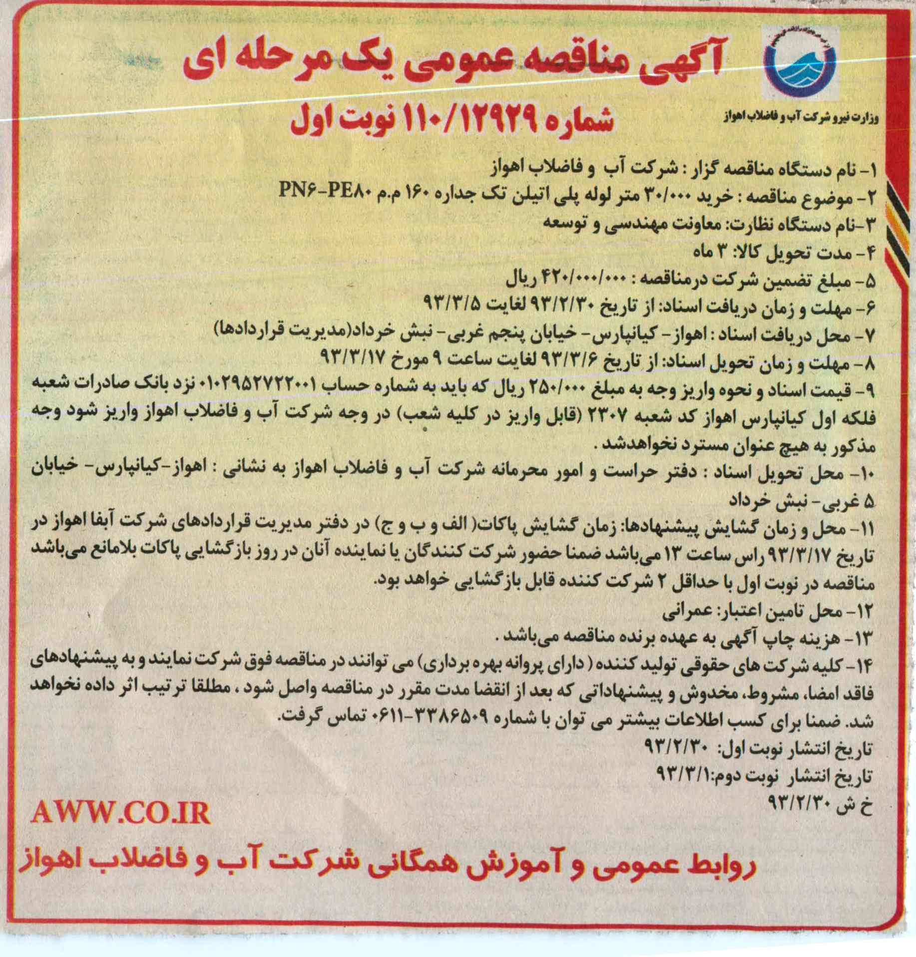 محل و زمان گشایش پیشنهادها: زمان گشایش پاکات الف و ب و ج در دفتر مدیریت قراردادهای شرکت آبفا اهواز در تاریخ 93.3.17 راس ساعت 13 می باشد ضمنا حضور شرکت کنندگان یا نماینده آنان در روز بازگشایی پاکات بلامانع می باشد مناقصه در نوبت اول با حداقل 2 شرکت کننده قابل بازگشایی خواهد بود