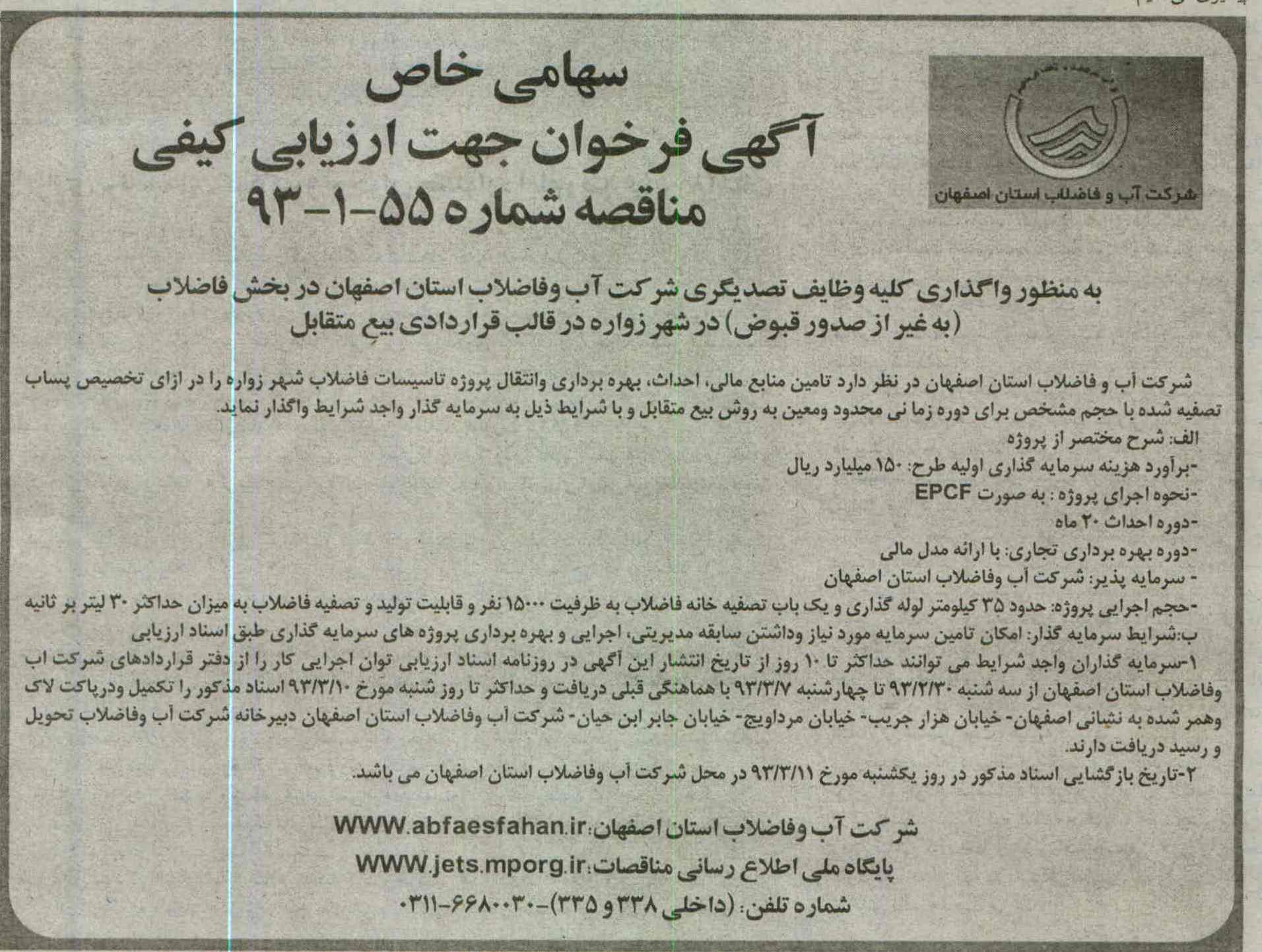 شرکت آب و فاضلاب استان اصفهان در نظر دارد تامین منابع مالی ، احداث ، بهره برداری وانتقال پروژه تاسیسات فاضلاب شهر زواره را در ازای تخصیص پساب تصفیه شده با حجم مشخص برای دوره زمانی محدود و معین به روش بیع متقابل و با شرایط ذیل به سرمایه گذار واجد شرایط واگذار نماید.