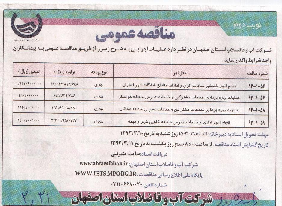 | 93-1-59 | انجام امور اداری و خدمات عمومی منطقه شاهین شهر و میمه | جاری | 3.201.453.732 | 140.100.000 |