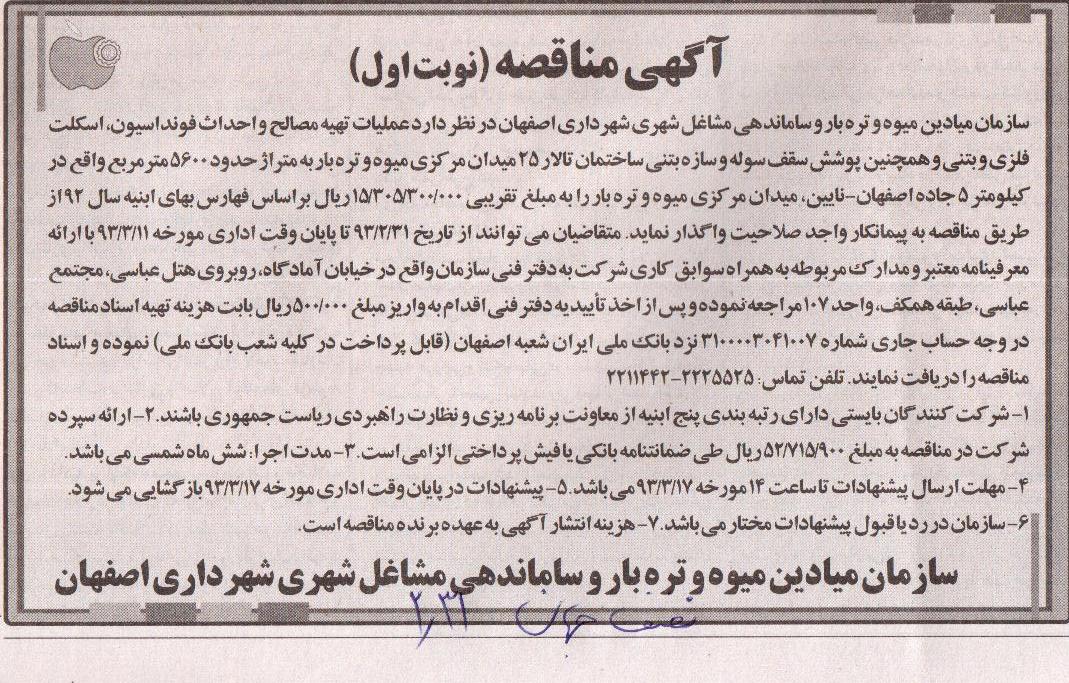 مهلت و محل دریافت و تحویل اسناد مناقصه و پیشنهاد قیمت: از شرکت های واجد شرایط دعوت می شود جهت کسب اطلاعات بیشستر و دریافت اسناد مناقصه تا پایان وقت اداری روز سه شنبه مورخ 93.3.20 به امور قراردادهای شهرداری نجف آباد مراجعه و پیشنهادات خود را حداکثر تا پایان وقت اداری روز پنجشنبه مورخ 93.3.24 به دبیرخانه محرمانه شهرداری نجف آباد تحویل نمایند (دریافت اسناد مناقصه به صورت حضوری و با ارایه معرفی نامه کتبی، با مهر و امضاء مجاز و تعهد آور شرکت انجام می گیرد)