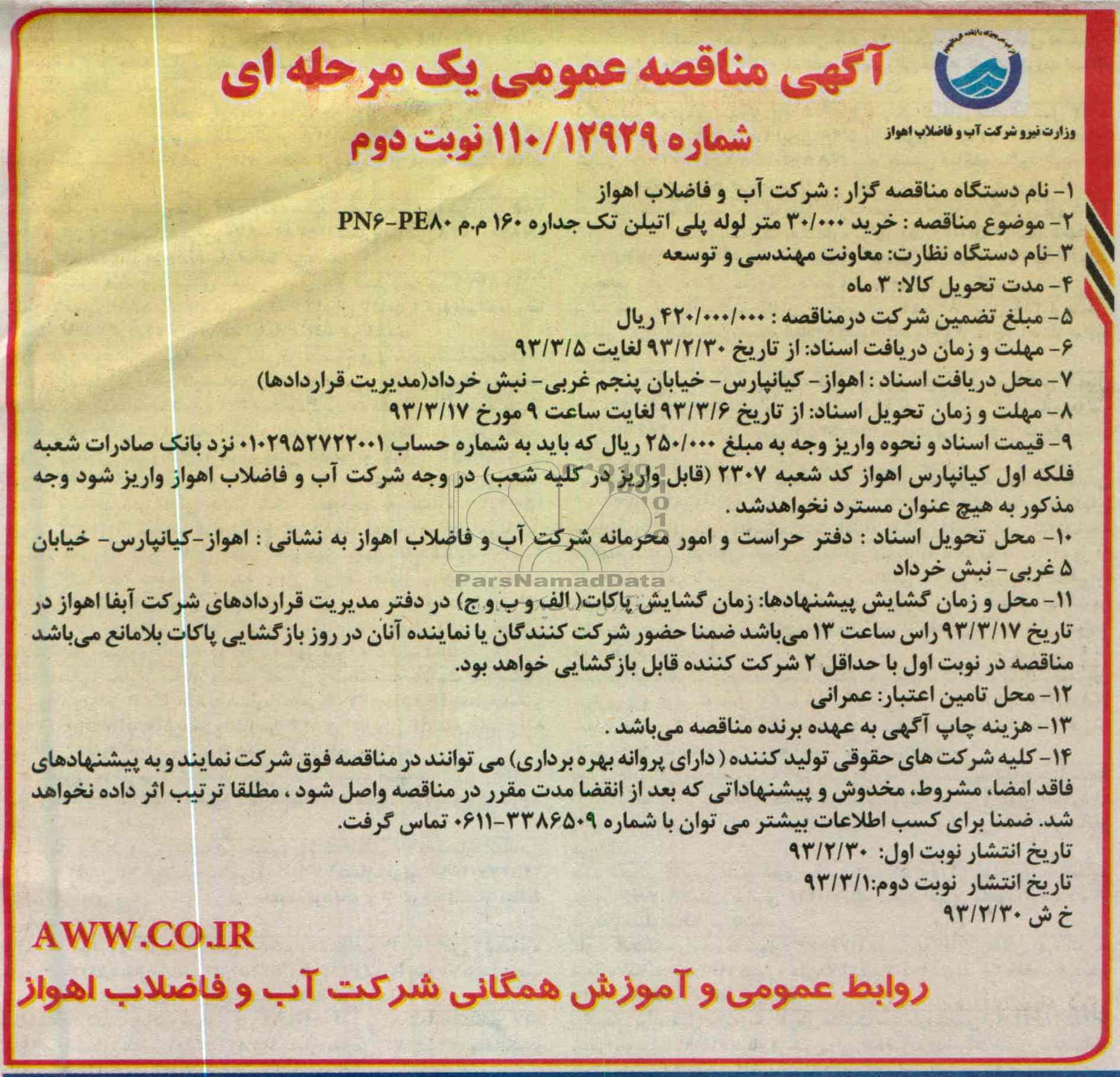 محل و زمان گشایش پیشنهادها: زمان گشایش پاکات الف و ب و ج در دفتر مدیریت قراردادهای شرکت آبفا اهواز در تاریخ 93.3.17 راس ساعت 13 می باشد ضمنا حضور شرکت کنندگان یا نماینده آنان در روز بازگشایی پاکات بلامانع می باشد مناقصه در نوبت اول با حداقل 2 شرکت کننده قابل بازگشایی خواهد بود