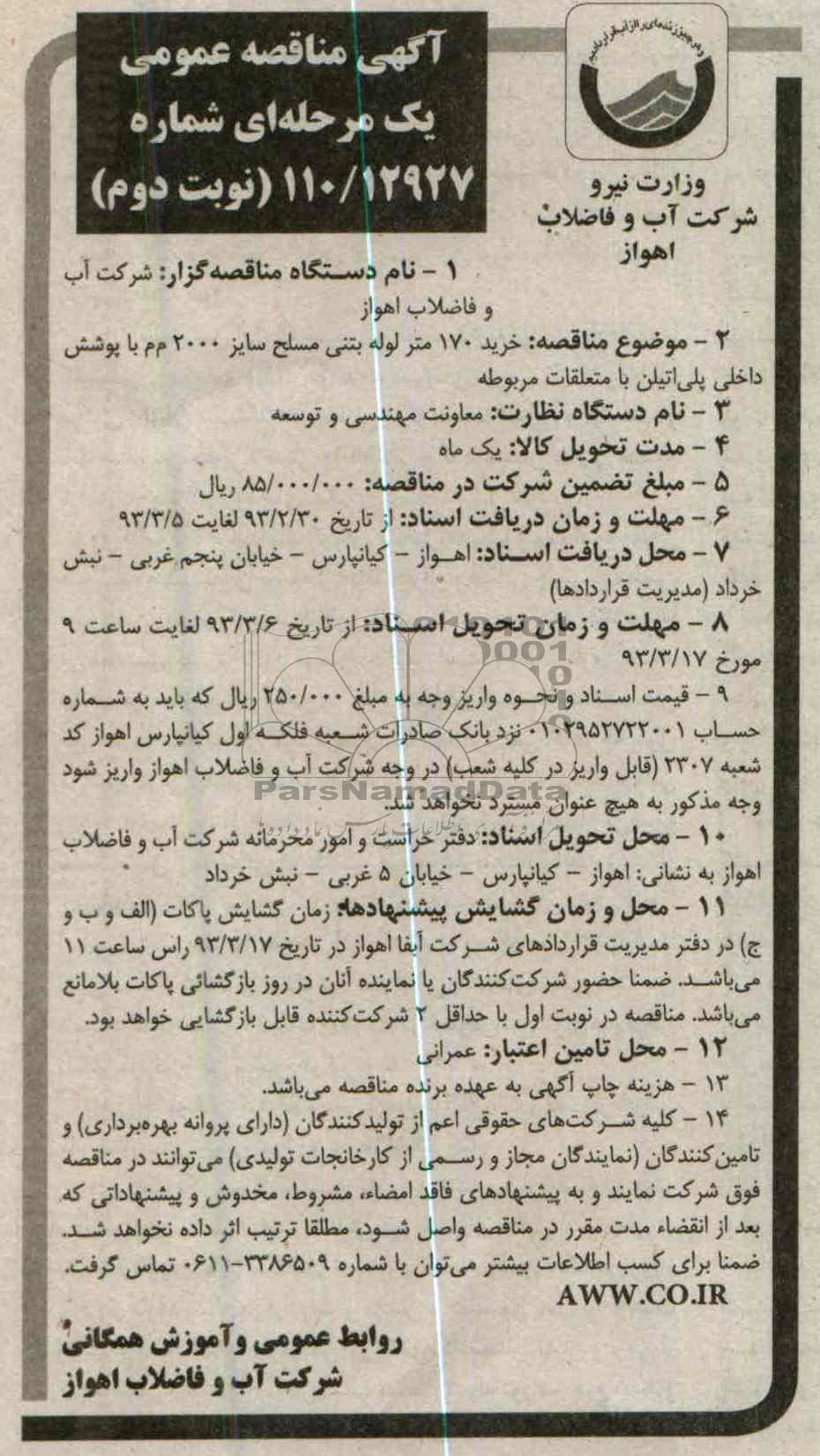 موضوع مناقصه: خرید 170 متر لوله بتنی مسلح سایز 2000 م م با پوشش داخلی پلی اتیلن با متعلقات مربوطه