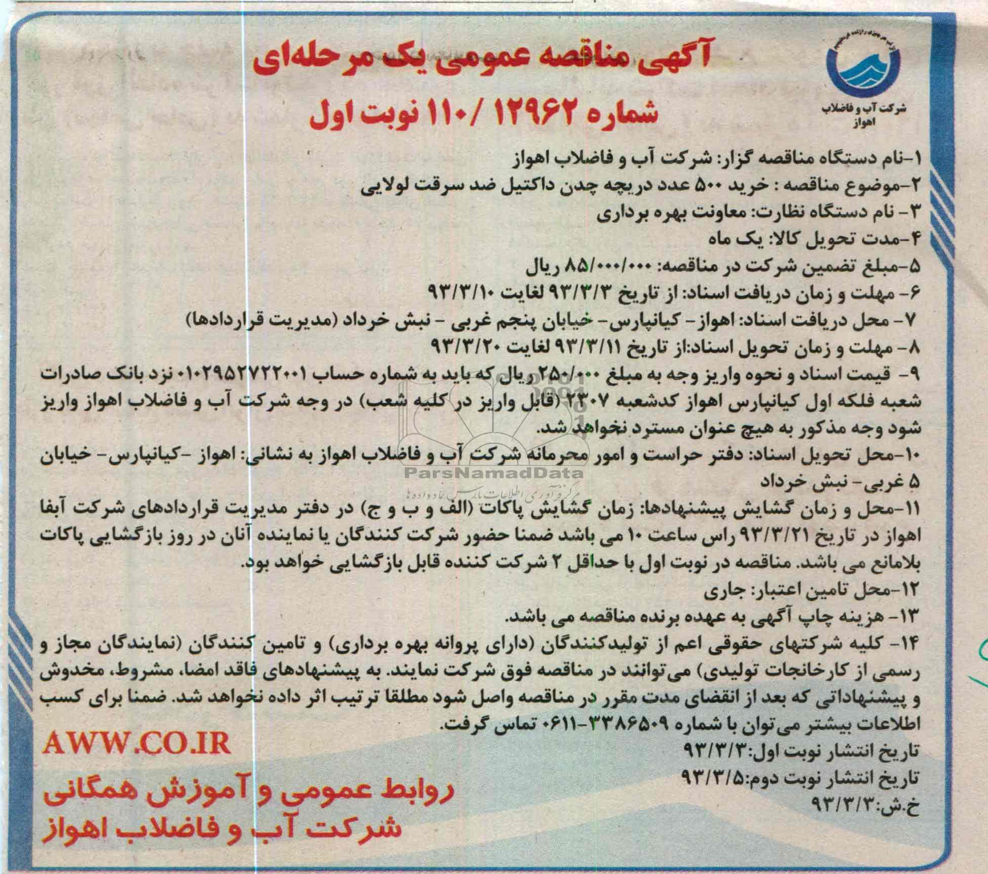 11- محل و زمان گشایش پیشنهادها: زمان گشایش پاکات الف و ب و ج در دفتر مدیریت قراردادهای شرکت آبفا اهوا زدر تاریخ 93.3.21 راس ساعت 10 می باشد ضمنا حضور شرکت کنندگان یا نماینده آنان در روز بازگشایی پاکات بلامانع می باشد. مناقصه در نوبت اول با حداقل 2 شرکت کننده قابل بازگشایی خواهد بود