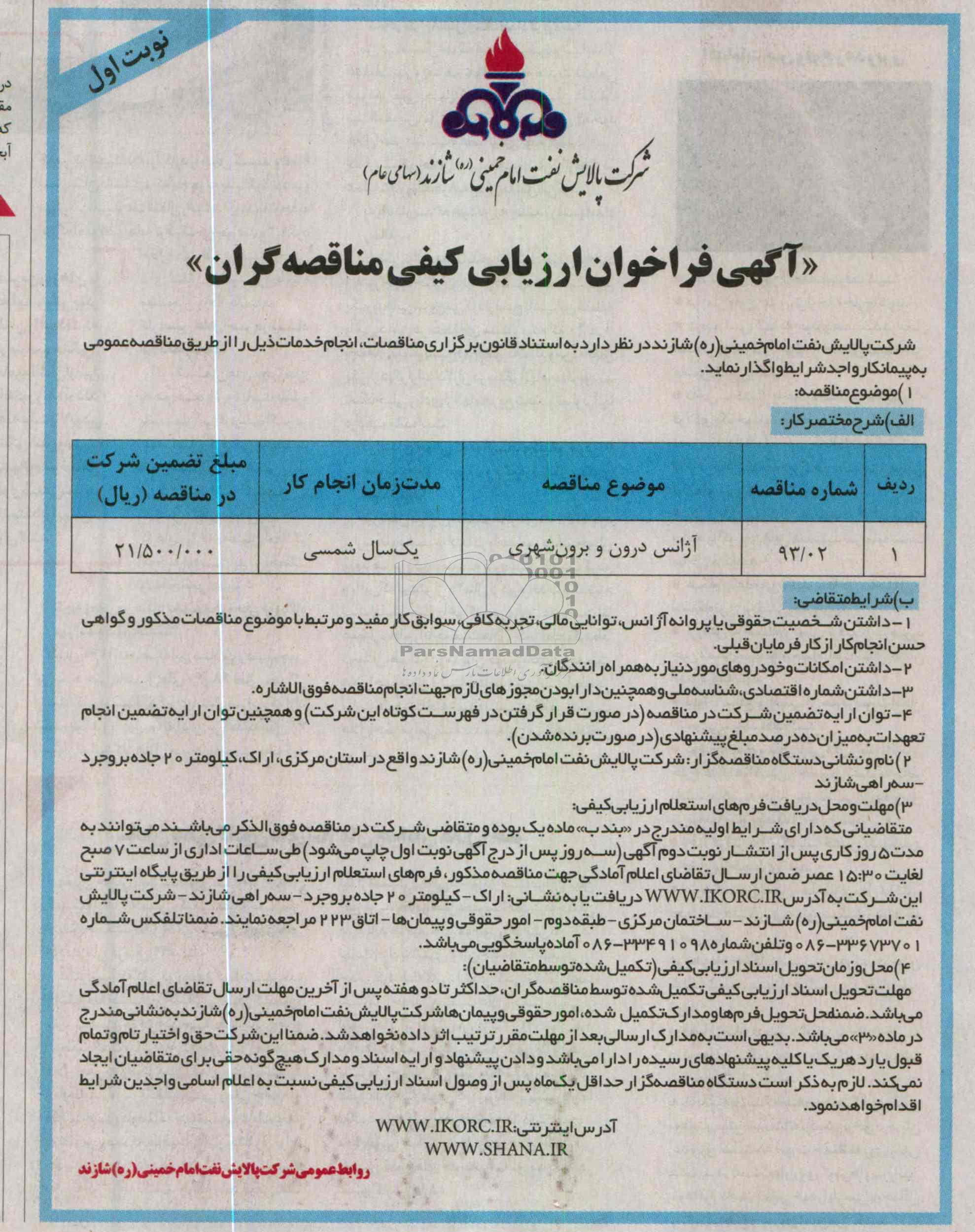 نام و نشانی مناقصه گزار: شرکت پالایش نفت امام خمینی شازند واقع در استان مرکزی اراک کیلومتر 20 جاده بروجرد - سه راهی شازند