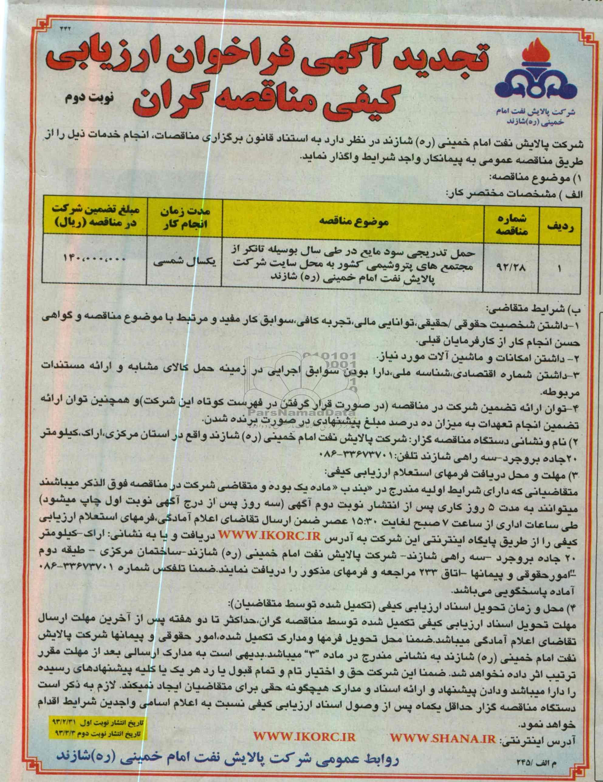 موضوع مناقصه: حمل تدریجی سود مایع در طی سال بوسیله تانکر از مجتمع های پتروشیمی کشور به محل سایت شرکت پالایش نفت امام خمینی ره شازند