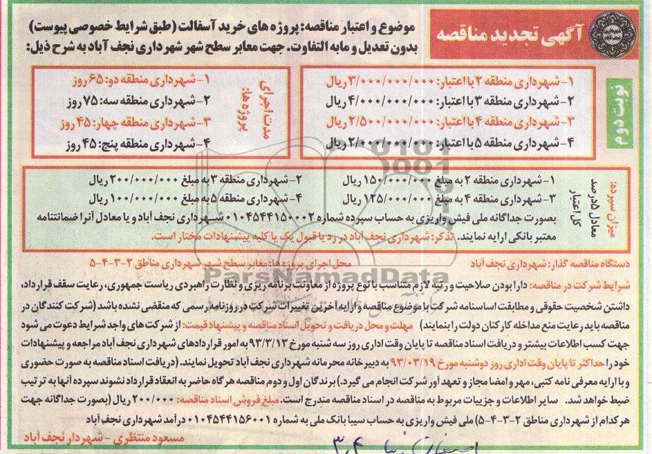 موضوع و اعتبار مناقصه: پروژه های خرید آسفالت (طبق شرایط خصوصی پیوست) بدون تعدیل و مابه التفاوت، جهت معابر سطح شهر شهرداری نجف آباد به شرح ذیل: