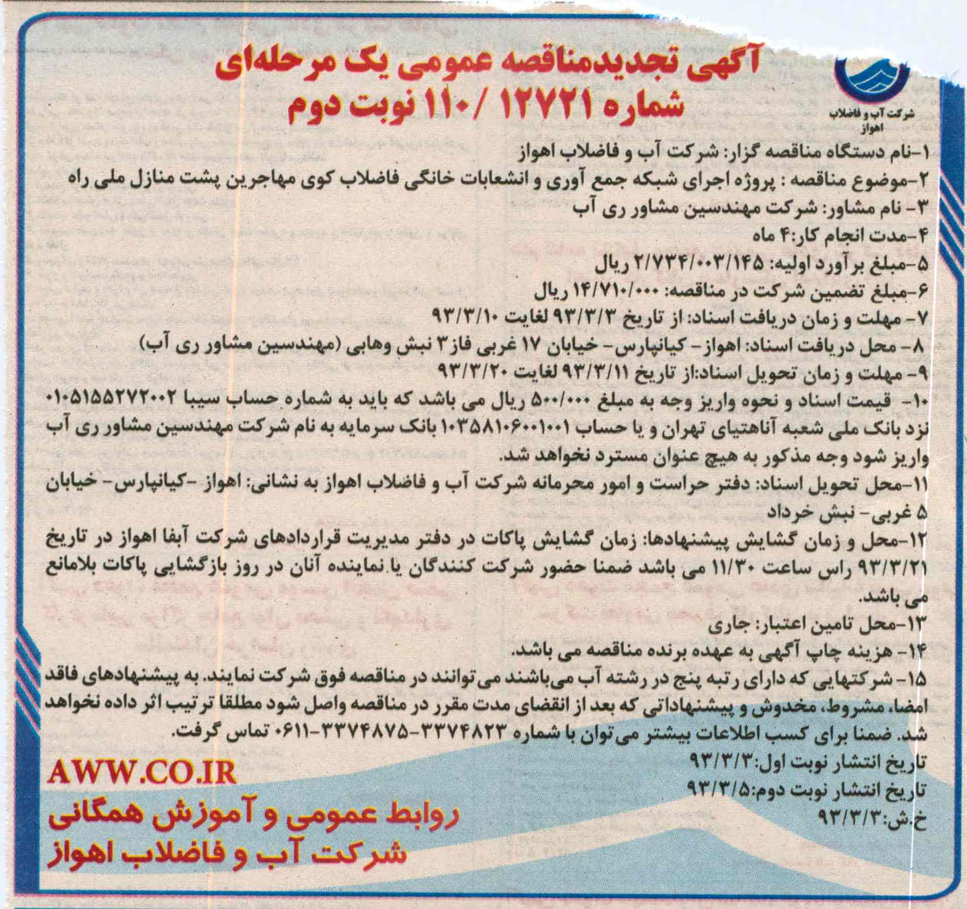 محل و زمان گشایش پیشنهادها زمان گشایش پاکات در دفتر مدیریت قراردادهای شرکت آبفا اهواز در تاریخ 93.3.21 راس ساعت 11:30 می باشد ضمنا حضور شرکت کنندگان یا نماینده انان در روز بازگشایی پاکات بلامانع می باشد