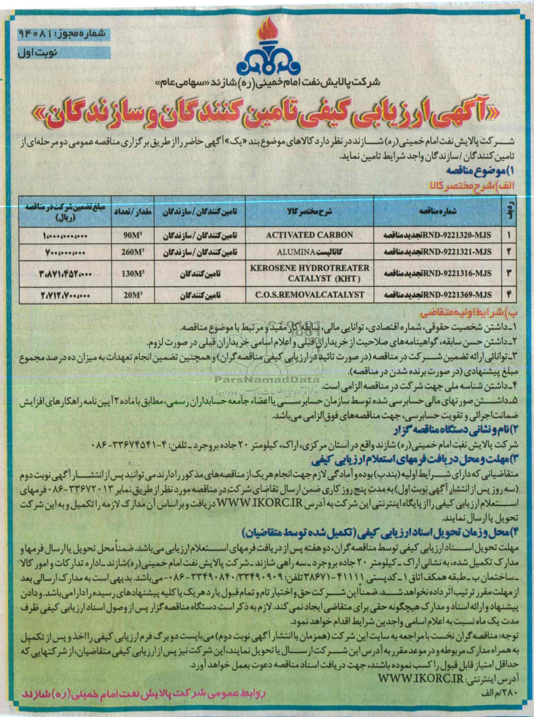 | RND-9221316-MJS تجدید مناقصه | KEROSENE HYDROTREATER CATALYST (KHT) | تامین کنندگان | 130M3 | 3.871.452.000 |