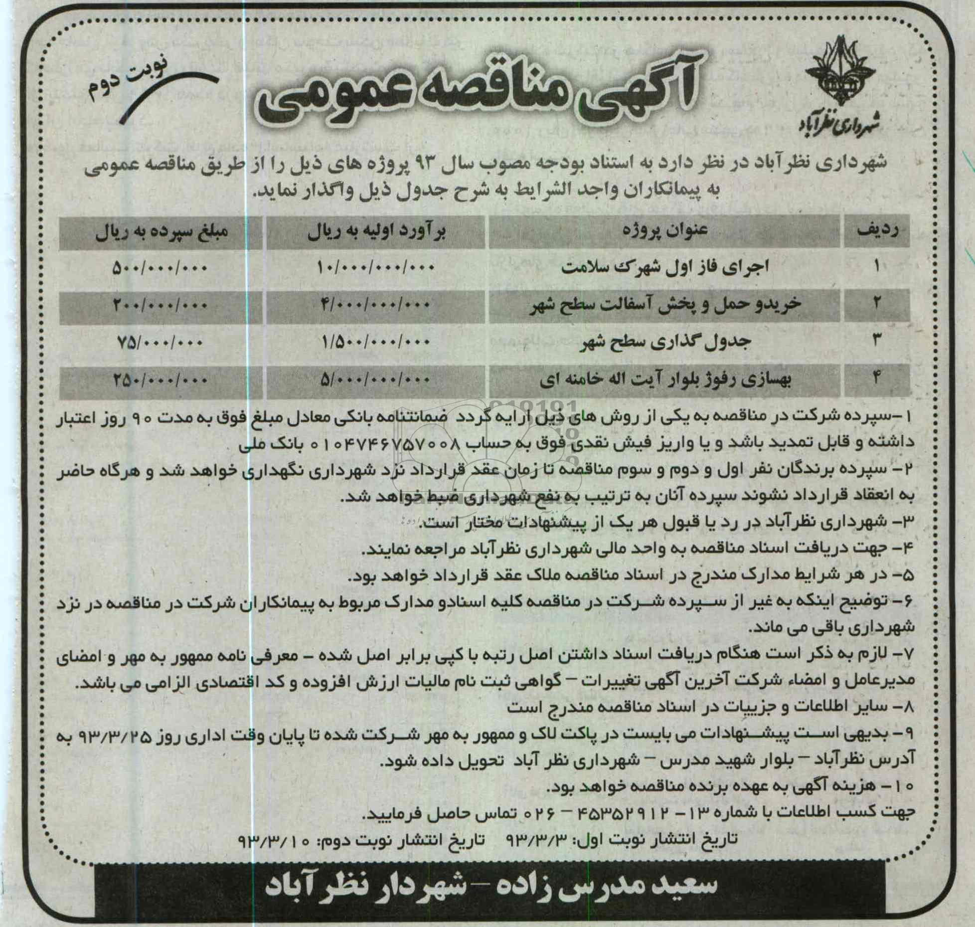 بدیهی است پیشنهادات می بایست در پاکت لاک و ممهور به مهر شرکت شده تا پایان وقت اداری روز 93.3.25 به آدرس نظرآباد خیابان مدرس شهرداری نظرآباد تحویل داده شود