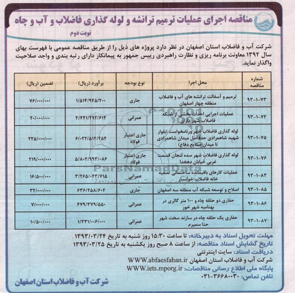 | 93-1-73 | ترمیم و آسفالت ترانشه های آب و فاضلاب منطقه چهار اصفهان | جاری | 1.514.945.200 | 76.000.000 |