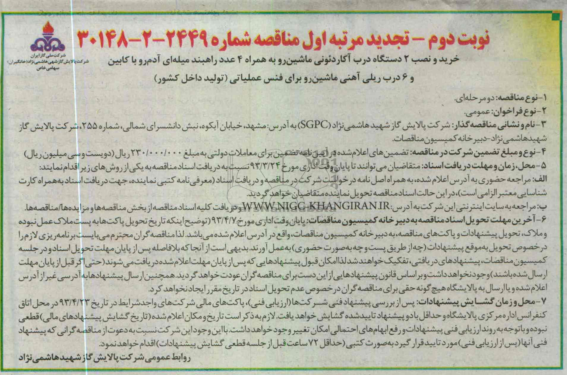 نام و نشانی مناقصه گذار: شرکت پالایش گاز شهید هاشمی نژاد SGPC به آدرس مشهد خیابان آبکوه نبش دانشسرای شمالی شماره 255 شرکت پالایش گاز شهید هاشمی نژاد دبیرخانه کمیسیون مناقصات