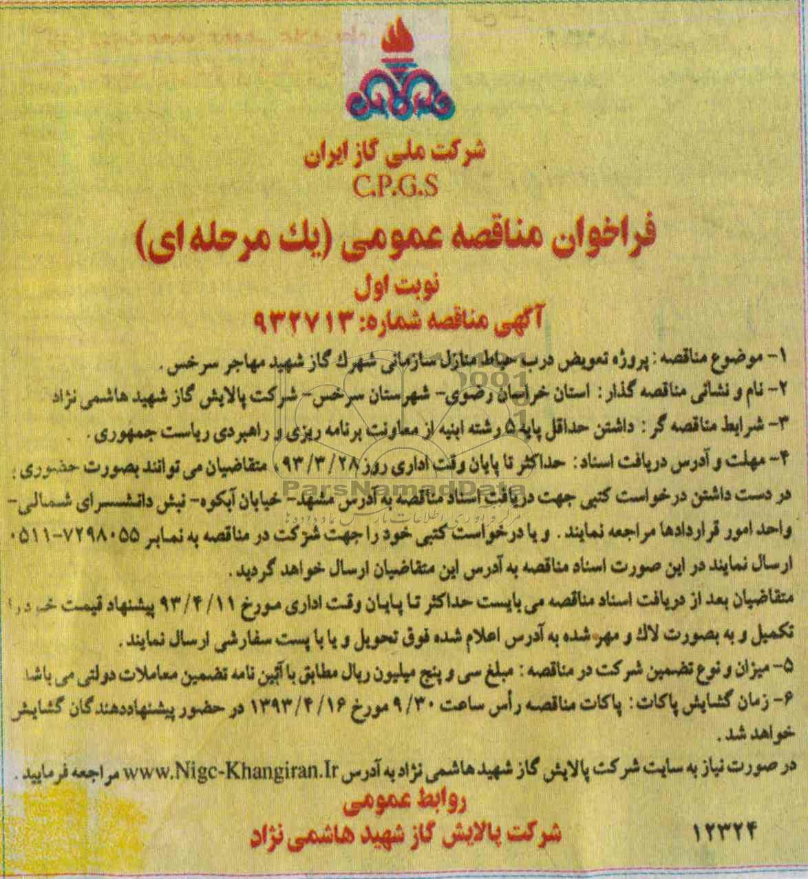 نام و نشانی مناقصه گذار : استان خراسان رضوی - شهرستان سرخس - شرکت پالایش گاز شهید هاشمی نژاد