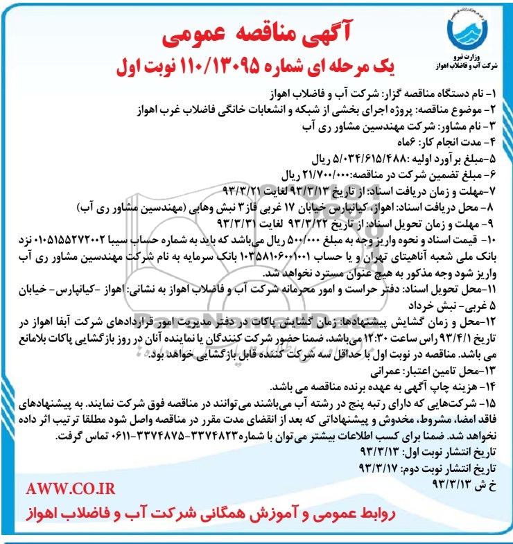 آگهی مناقصه عمومی یک مرحله ای, پروژه اجرای بخشی از شبکه و انشعابات خانگی و ...