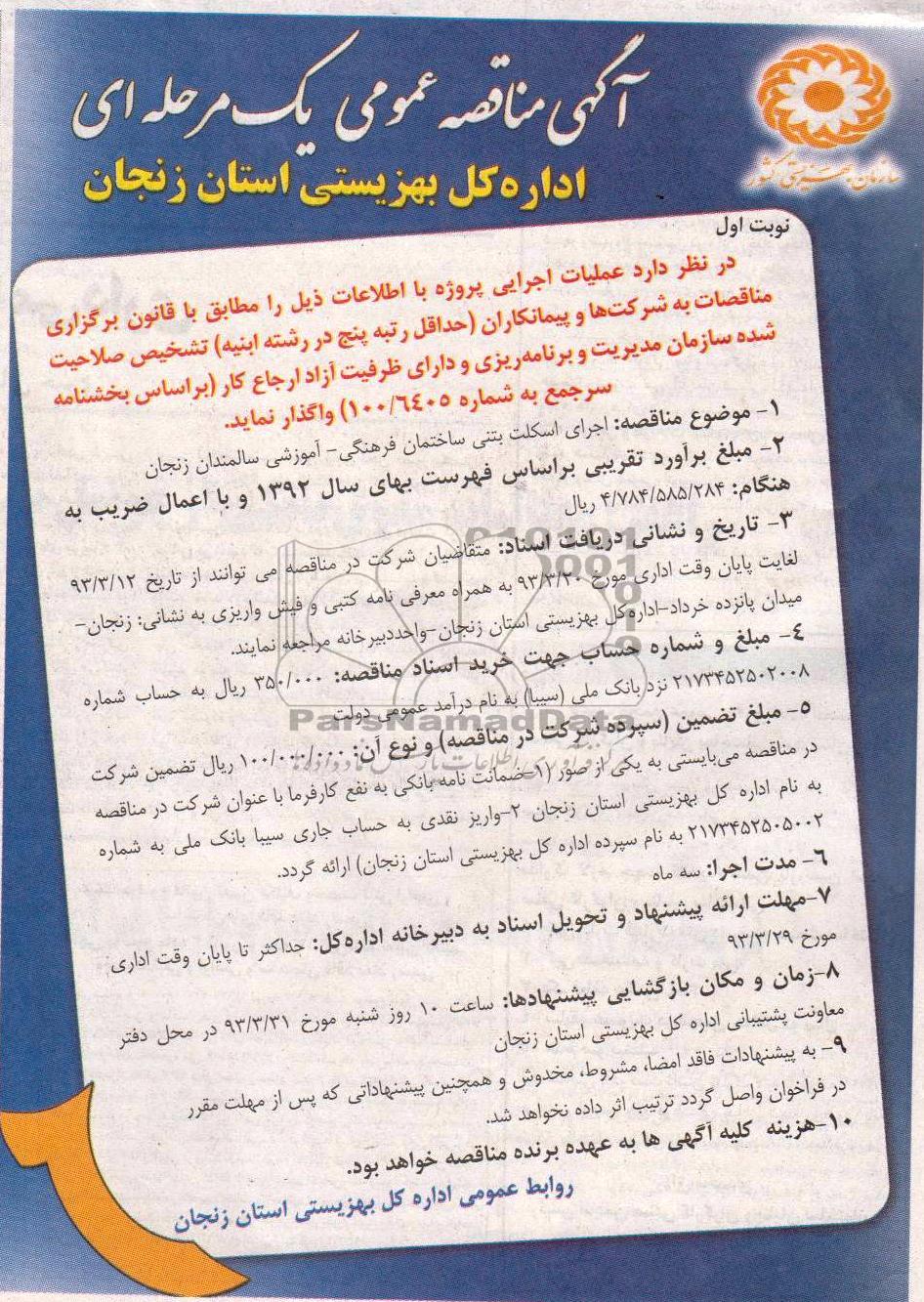 موضوع مناقصه : اجرای اسکلت بتنی ساختمات فرهنگی - آموزشی سالمندان زنجان