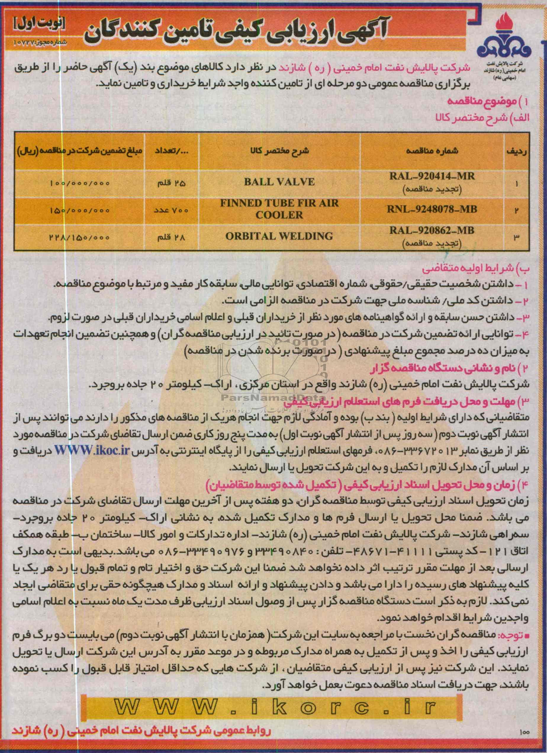 شرکت پالایش نفت امام خمینی (ره) شازند در نظر دارد کالاهای موضوع بند یک آگهی حاضر را از طریق برگزاری مناقصه عمومی دو مرحله ای از تامین کنندگان واجد شرایط خریداری نماید.