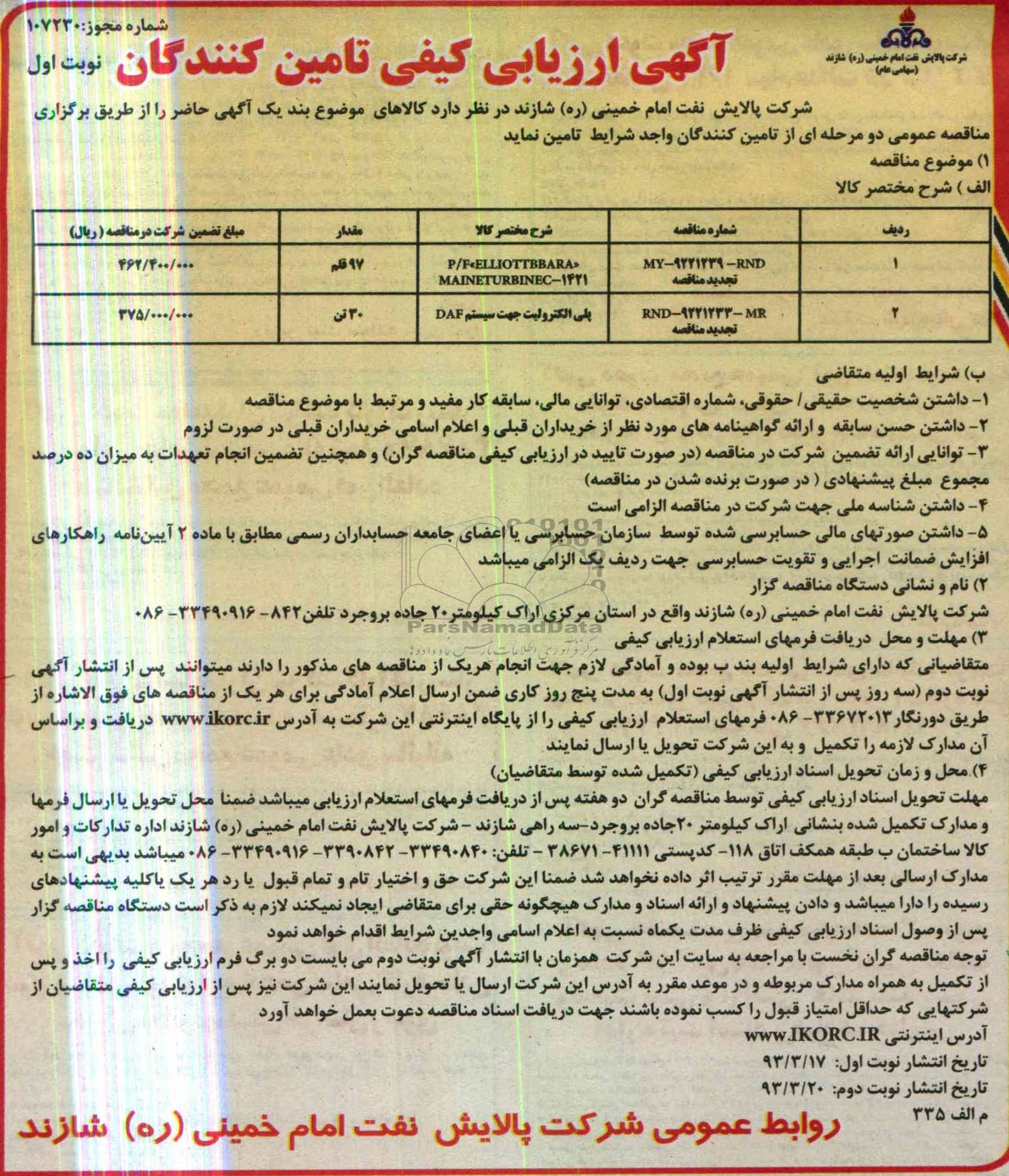 متقاضیانی که دارای شرایط اولیه بند ب بوده و آمادگی لازم جهت انجام هر یک از مناقصات مذکور را دارند می توانند پس از انتشار آگهی نوبت دوم سه روز پس از انتشار آگهی نوبت اول به مدت پنج روز کاری فرمهای استعلام ارزیابی کیفی را از پایگاه اینترنتی این شرکت به آدرس WWW.IKORC.IR دریافت و بر اساس آن مدارک لازمه را تکمیل و به این شرکت تحویل یا ارسال نمایند