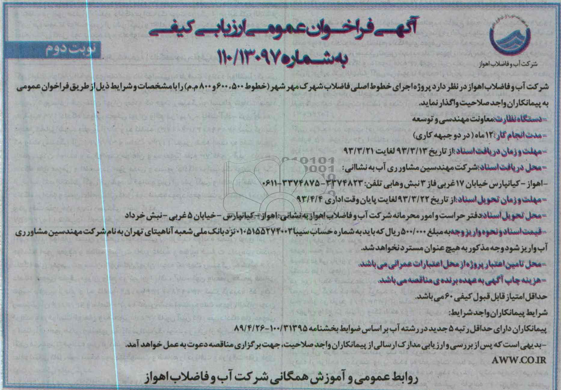 محل تحویل اسناد: دفتر حراست و امور محرمانه شرکت آب و فاضلاب اهواز به نشانی: اهواز- کیانپارس- خیابان 5 غربی- نبش خرداد