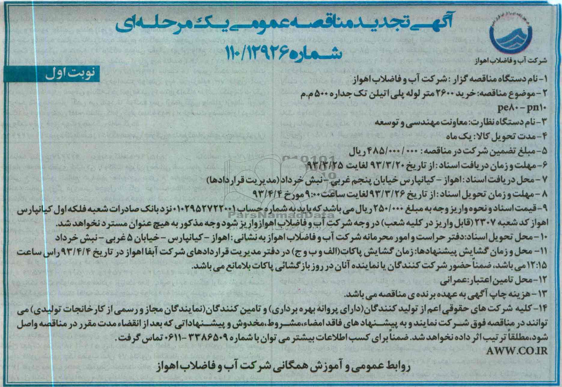 آگهی تجدید مناقصه عمومی یک مرحله ای , خرید 2600 متر لوله پلی اتیلن تک جداره