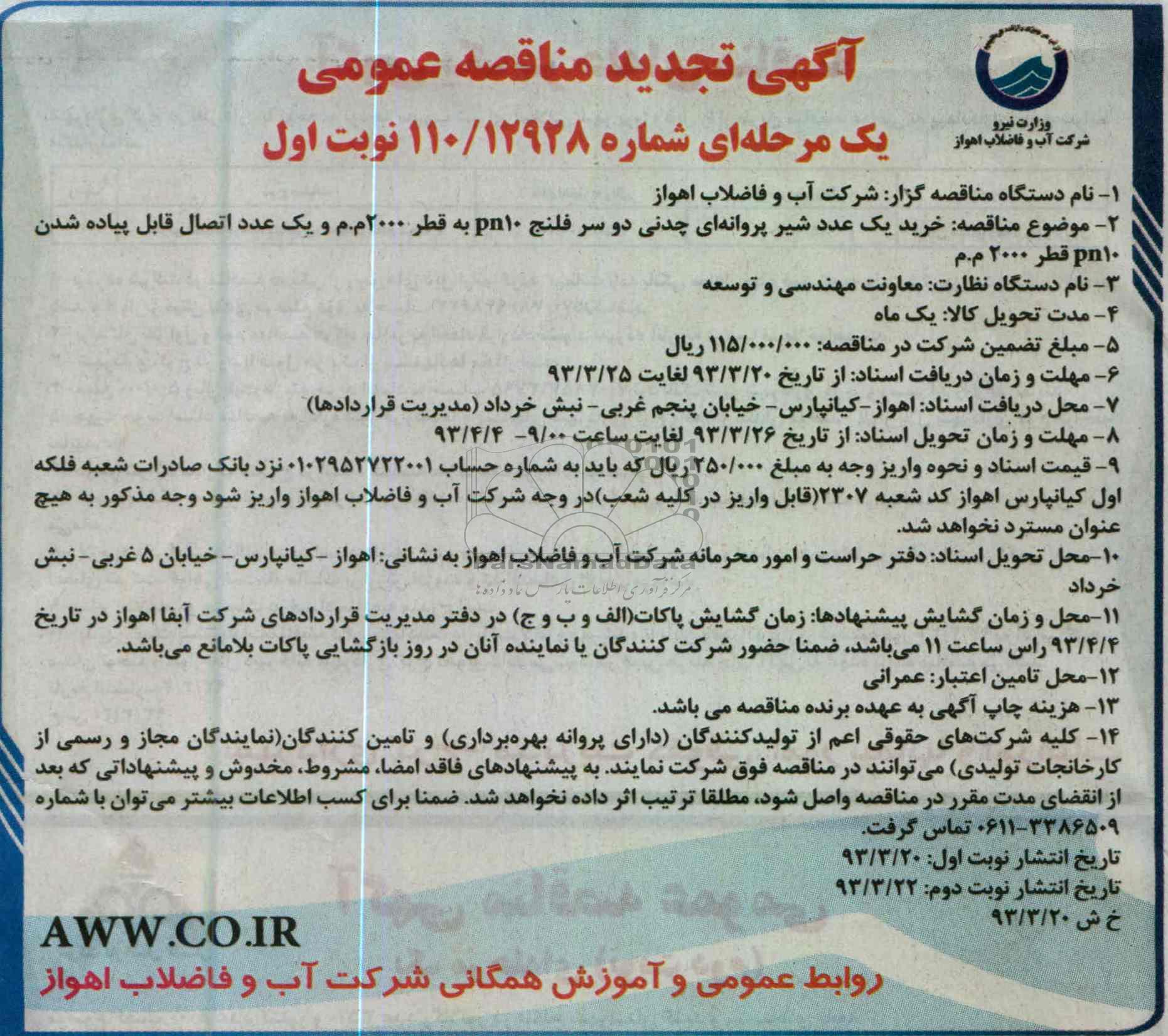 تاریخ انتشار نوبت اول: 93.3.20موضوع مناقصه : خرید یک عدد شیر پروانه ای چدنی دو سر فلنج PN10 به قطر 2000 م.م و یک عدد اتصال قابل پیاده شدن PN10 قطر 2000 م.م