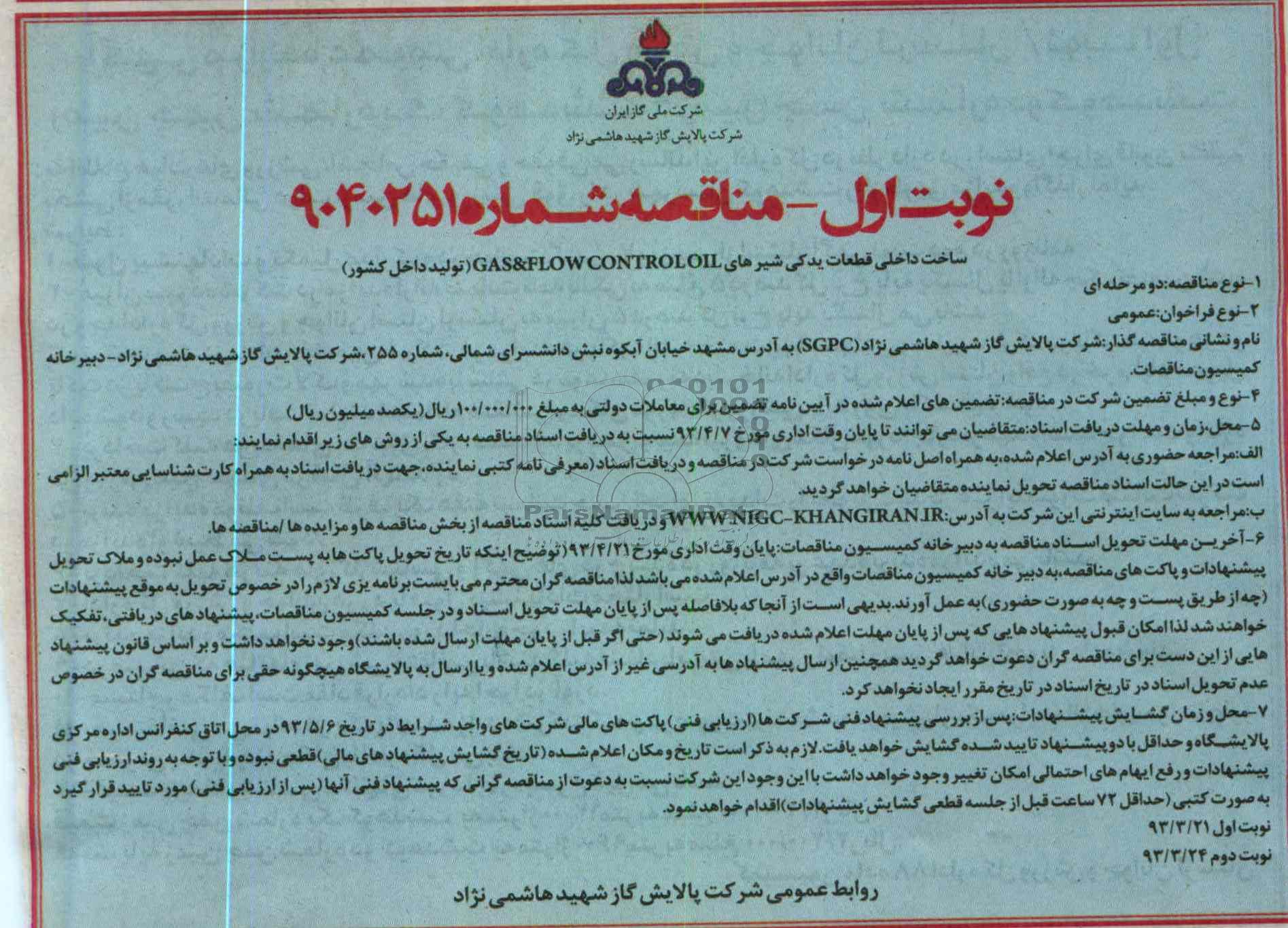 مناقصه , ساخت داخلی قطعات یدکی شیرهای GAS & FLOW CONTROL OIL