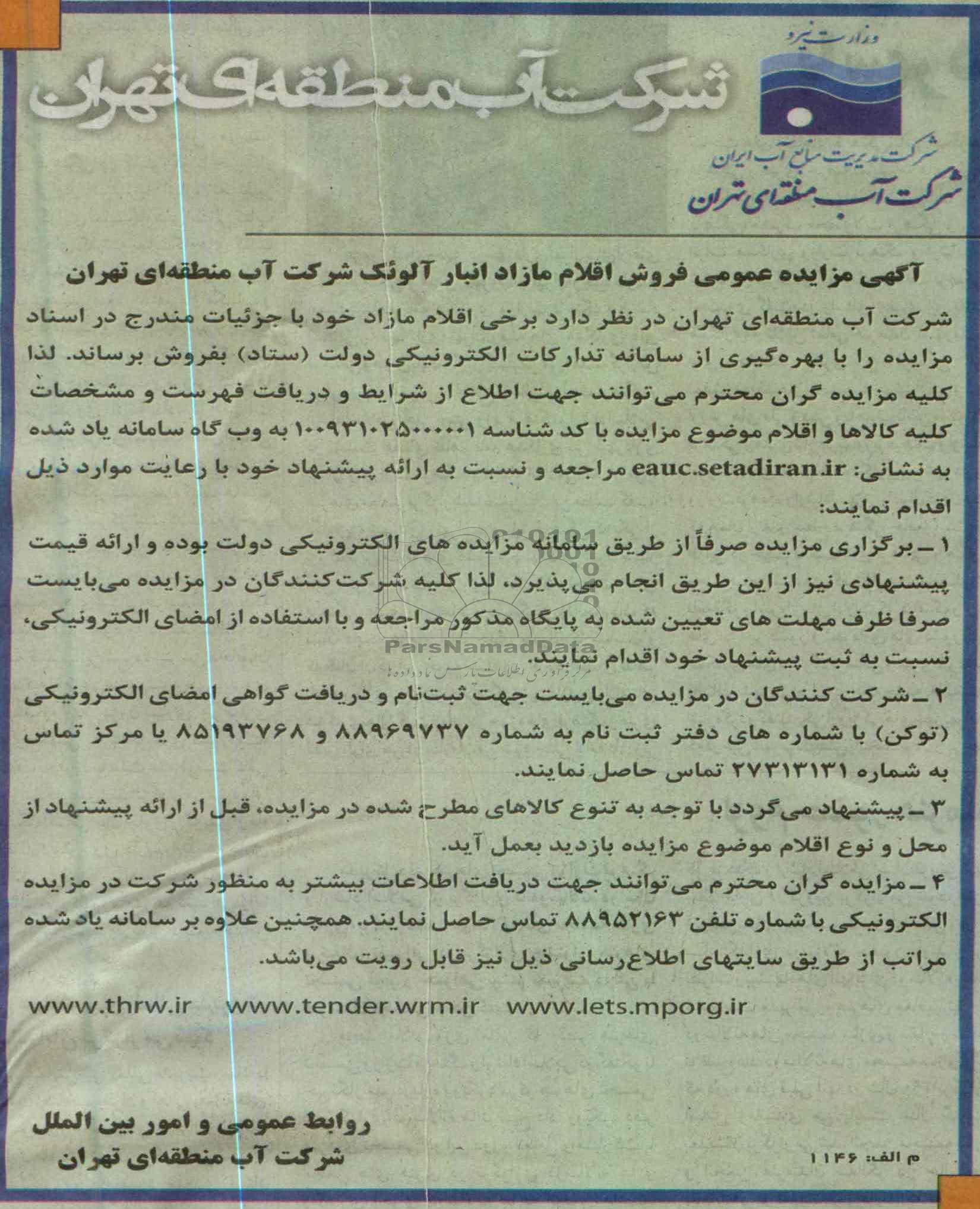 شرکت آب منطقه ای تهران درنظردارد برخی اقلام مازاد با جزئیات مندرج در اسناد مزایده را با بهره گیری از سامانه تدارکات الکترونیکی دولت ستاد بفروش برساند لذا کلیه مزایده گران محترم می توانندجهت اطلاع از شرایط و دریافت فهرست و مشخصات کلیه کالاها و اقلام موضوع مزایده با کد شناسه 100931025000001 به وب گاه سامانه یاد شده به نشانی EAUC.SETADIRAN.IR مراجعه و نسبت به ارائه پیشنهاد خود با رعایت موارد ذیل اقدام نمایند