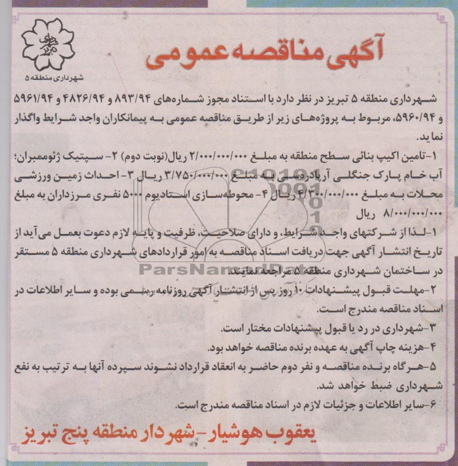 شهرداری منطقه 5 تبریز دارد با استناد مجوز شماره های 94/893 و 94/4826 و 94/5961 و 94/5960 مربوط به پروژه های زیر از طریق مناقصه عمومی به پیمانکاران واجد شرایط واگذار نماید.