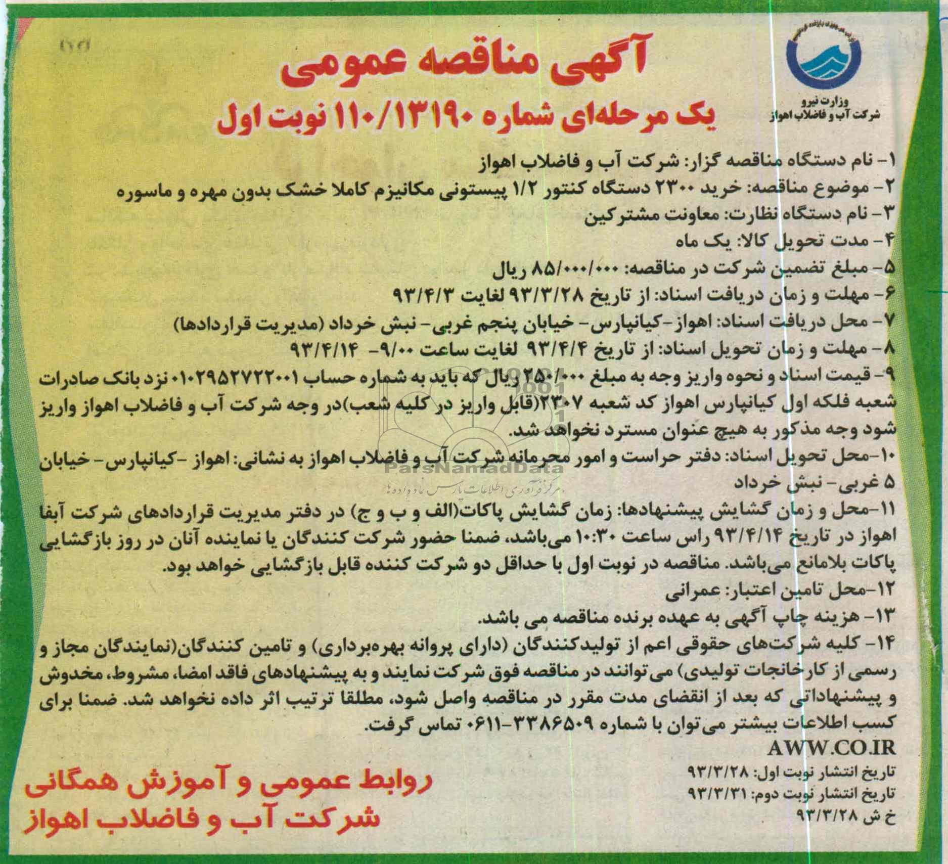 این مناقصه در تاریخ 1393/03/28 شروع و مهلت آن تا تاریخ 1393/04/03 میباشد.