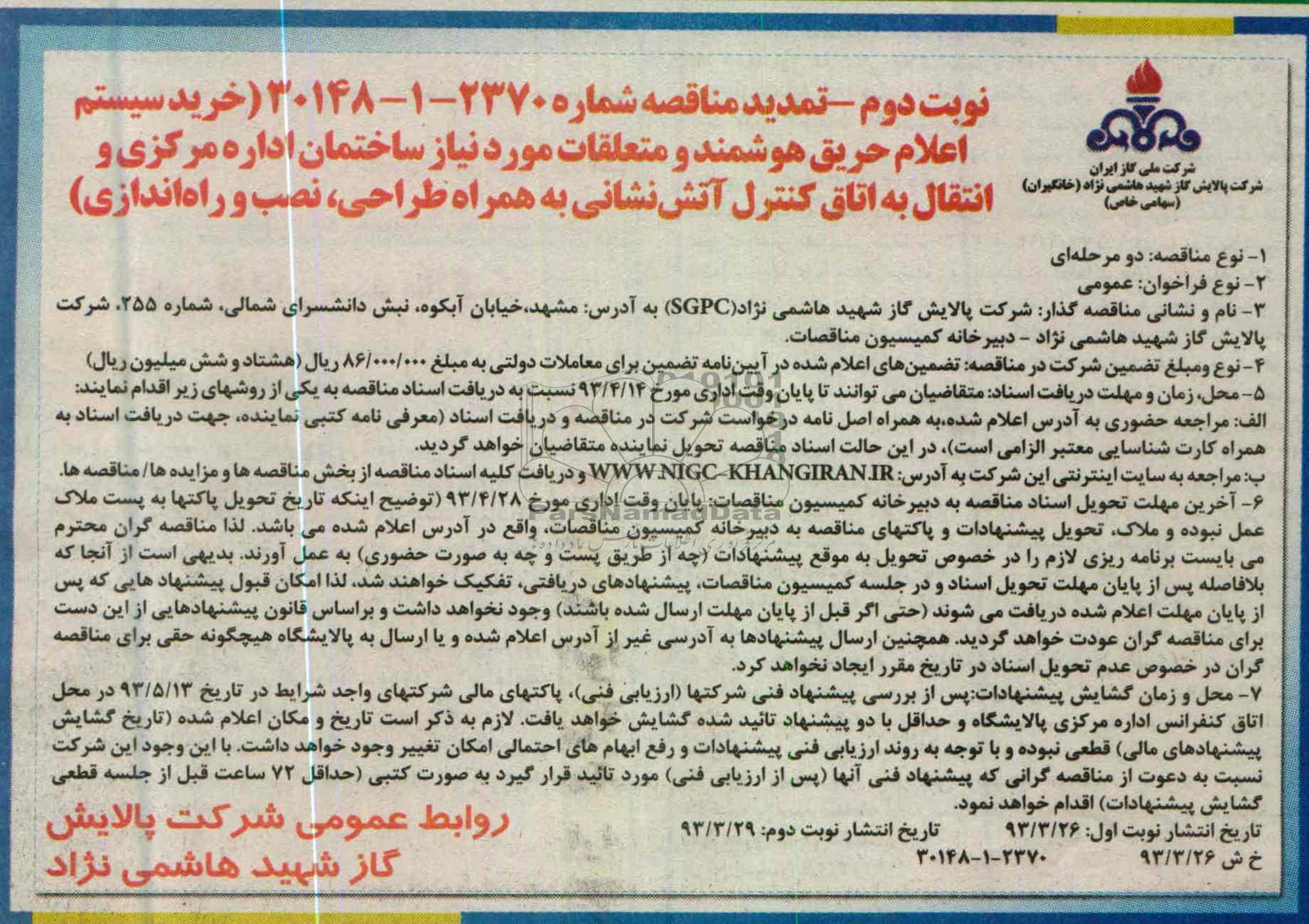 نام و نشانی مناقصه گزار: شرکت پالایش گاز شهید هاشمی نژاد (SGPC) به آدرس مشهد خیابان آبکوه نبش دانشسرای شمالی شماره 255 شرکت پالایش گاز شهید هاشمی نژاد دبیرخانه کمیسیون مناقصات