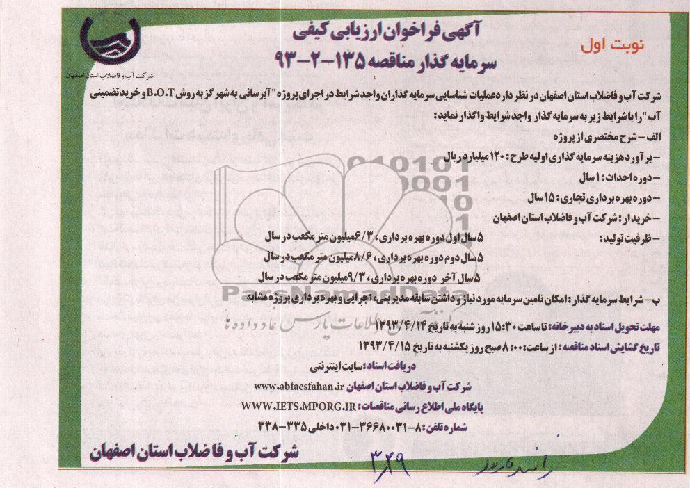 شرکت آب و فاضلاب استان اصفهان در نظر دارد عملیات شناسایی سرمایه گذاران واجد شرایط در اجرای پروژه "آبرسانی به شهر گز به روش B.O.T و خرید تضمینی آب" را با شرایط زیر به سرمایه گذار واجد شرایط واگذار نماید: