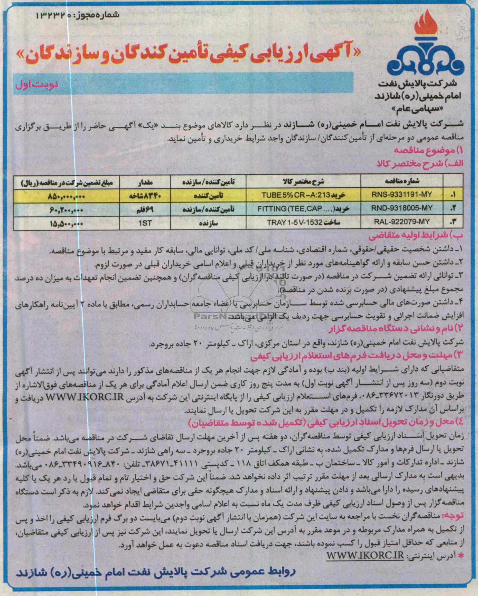 شرکت پالایش نفت امام خمینی ره شازند در نظر دارد کالای موضوع بند یک آ"هی حاضر را از طریق برگزاری مناقصه عمومی دو مرحله ای از تامین کنندگان / سازندگان واجد شرایط خریداری و تامین نماید.