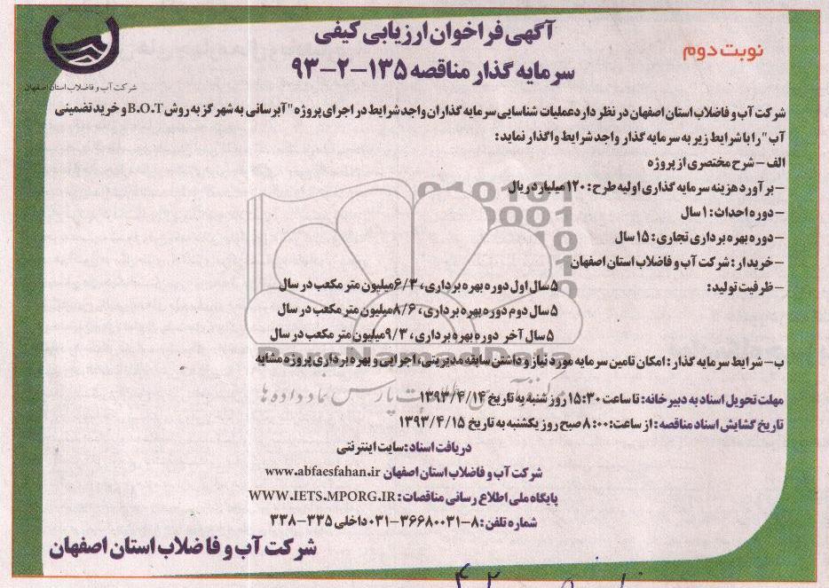 شرکت اب و فاضلاب استان اصفهان درنظرداردعملیات شناسی سرمایه گذاران واجد شرایط در اجرای پروژه آبرسانی به شهر گز به روش b.o.t و خرید تضمینی آب را با شرایط زیر به سرمایه گذار واجد شرایط واگذار نماید