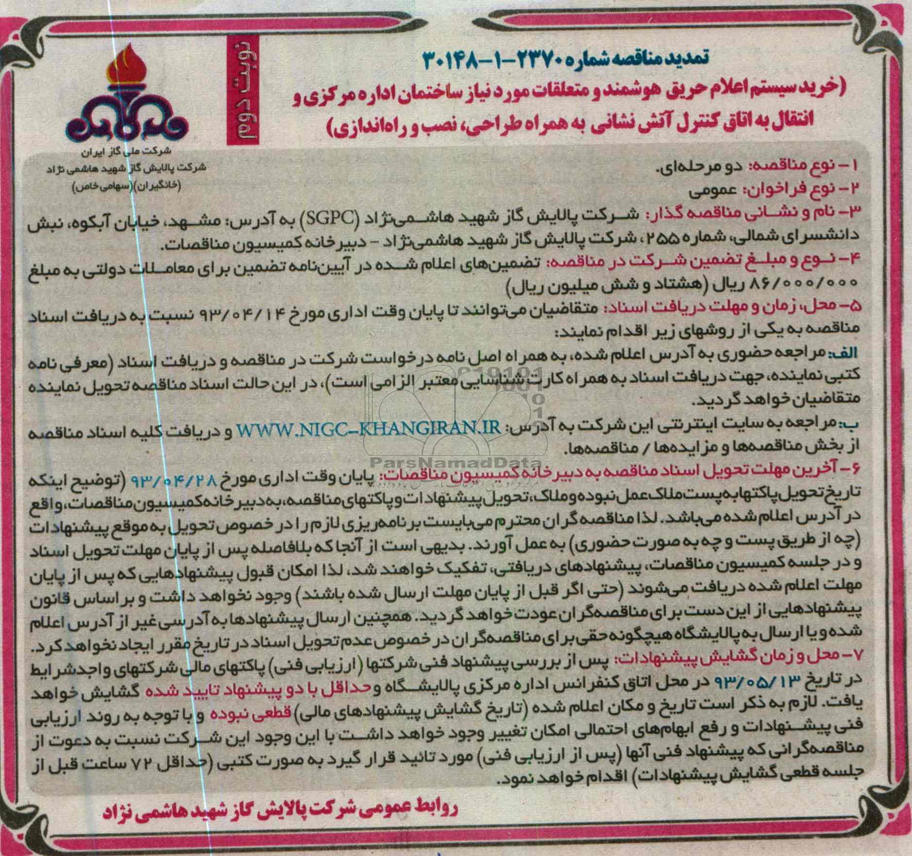نام و نشانی مناقصه گزار: شرکت پالایش گاز شهید هاشمی نژاد (SGPC) به آدرس مشهد خیابان آبکوه نبش دانشسرای شمالی شماره 255 شرکت پالایش گاز شهید هاشمی نژاد دبیرخانه کمیسیون مناقصات