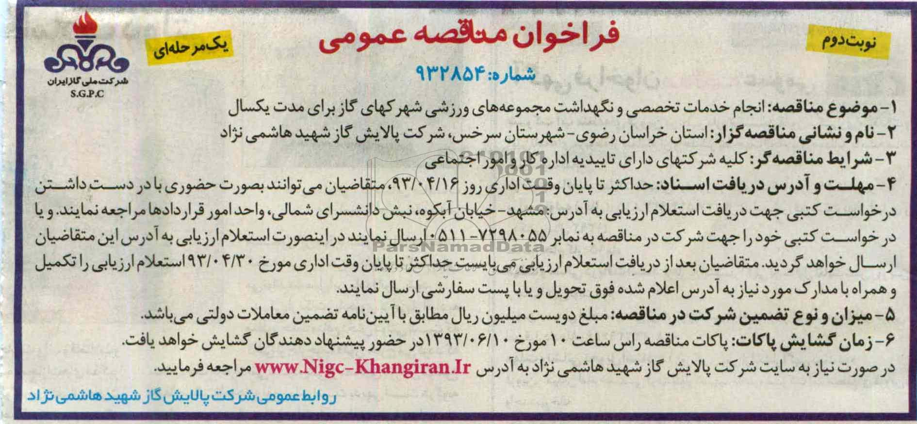 موضوع مناقصه : انجام خدمات تخصصی و نگهداشت مجموعه های ورزشی شهرکهای گاز برای مدت یک سال